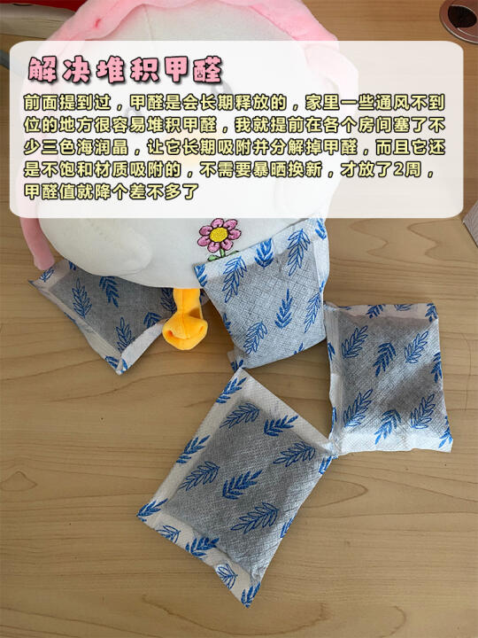 前面提到过,甲醛是会长期释放的,家里一些通风不到位的地方很容易堆积甲醛,我就提前在各个房间塞了不少三色海润晶,让它长期吸附并分解掉甲醛,而且它还是不饱和材质吸附的,不需要暴晒换新,才放了2周,甲醛值就降个差不多了