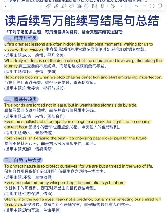 一、读后续写之精准动词替换 二、读后续写万能续写结尾句总结 三、20类高分万能主题升华句