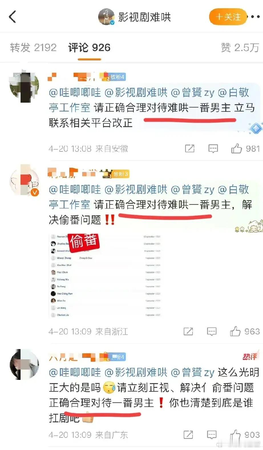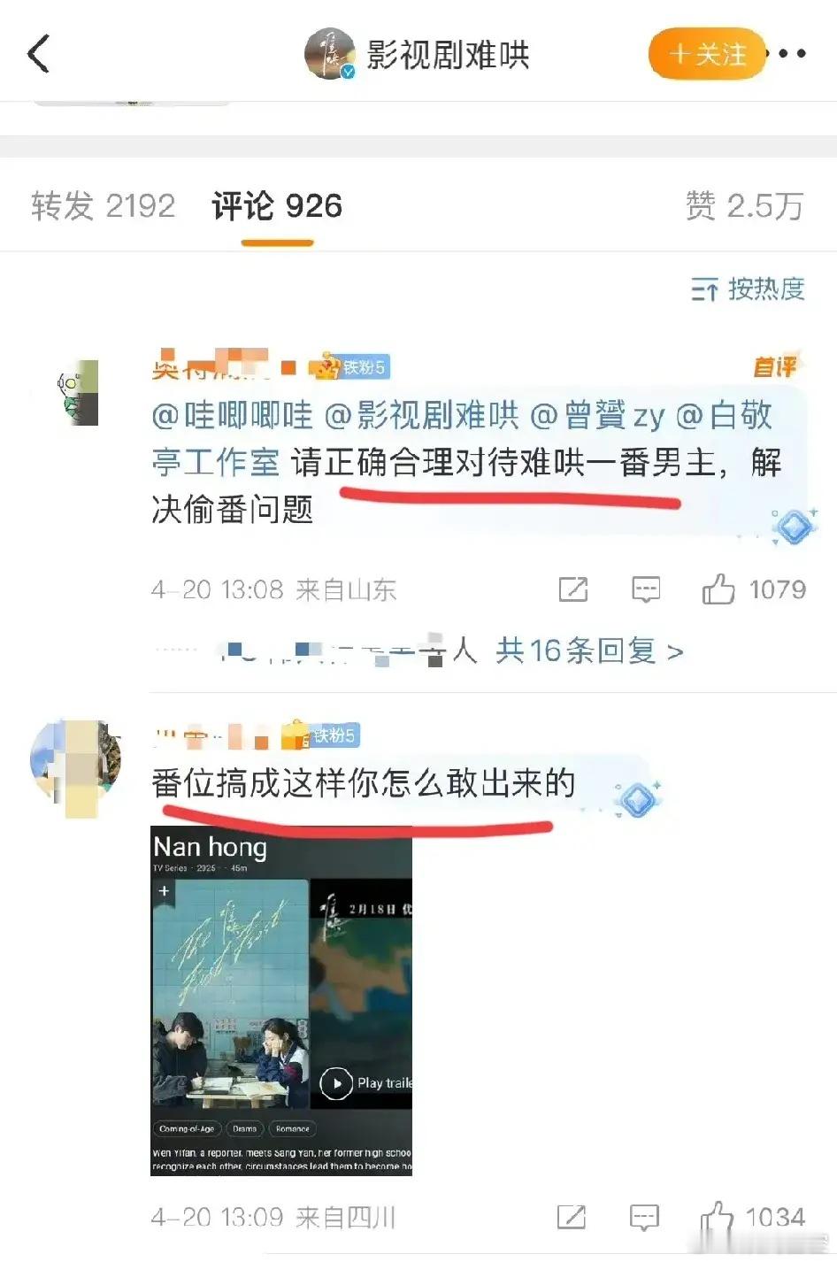 白敬亭粉丝不满意《难哄》海外版把章若楠的名字写在白敬亭之前,开始向剧方哇唧唧哇维权。