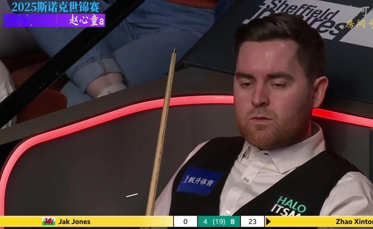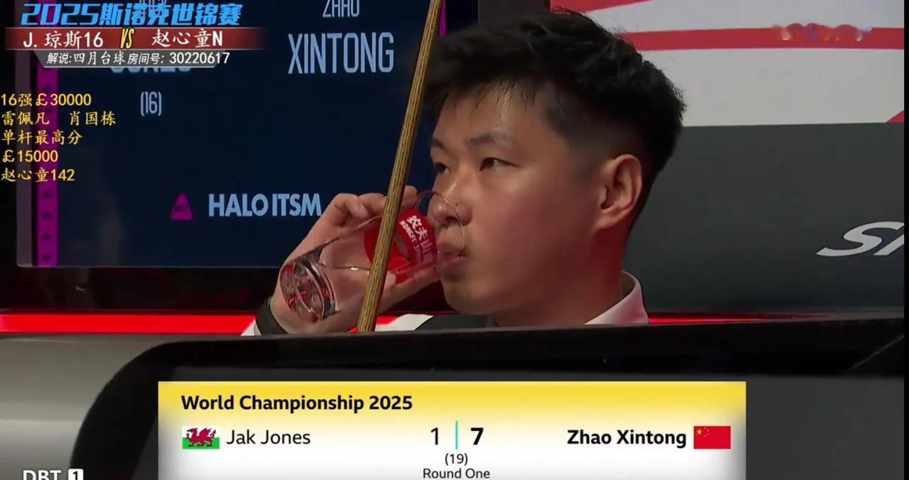 世锦赛,重返职业即巅峰,中国小火前赵心童,狂虐世锦赛亚军,9:4,晋级16强在望。 2025斯诺克世锦赛第1轮,持外卡参赛的赵心童,挑战上届亚军,世界排名第16的杰克.琼斯。 第1局,赵心童单杆84分,128:1取得开门红。 第2局,赵心童多次上手以90:29再胜。 第3局,琼斯单杆打出99分以99:6拿下。 第4局,赵心童单杆91分,91:1,大比分3-1。 第5局,赵心童单杆142分,4-1领先。第6局,赵心童单杆70分,70:25拿下。 第7局,赵心童单杆76分,76:1,取胜。 第8局,赵心童单杆61分,115:1,大比分7:1。 第9局,琼斯单杆70分拿下,赵心童取得7:2的绝对优势。 第二阶段比赛, 第10局,杰克.琼斯先扳回1局, 第11局,赵心童追分时简单失误,琼斯79:49再追一局, 第12局,赵心童防守随意了,琼斯上手35出现失误,几经防守,赵心童抓住机会单杆打出70分,延分,转入防守,之后琼斯防漏球,赵心童取得大比分8:4。 第13局,赵心童拼进长台,23时打丢中袋蓝球,琼斯拼长台差的离谱,赵心童单杆55分,78:0,9:4拿到赛点。 祝贺赵心童,成为本届第3位晋级16强的中国选手。