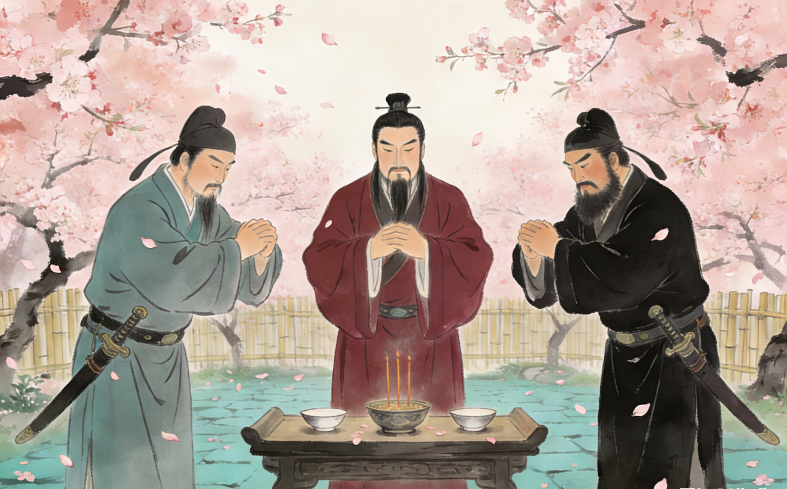 飞曰:“吾庄后有一桃园,花开正盛,明日当于园中祭告天地,我三人结为兄弟,协力同心,然后可图大事。”