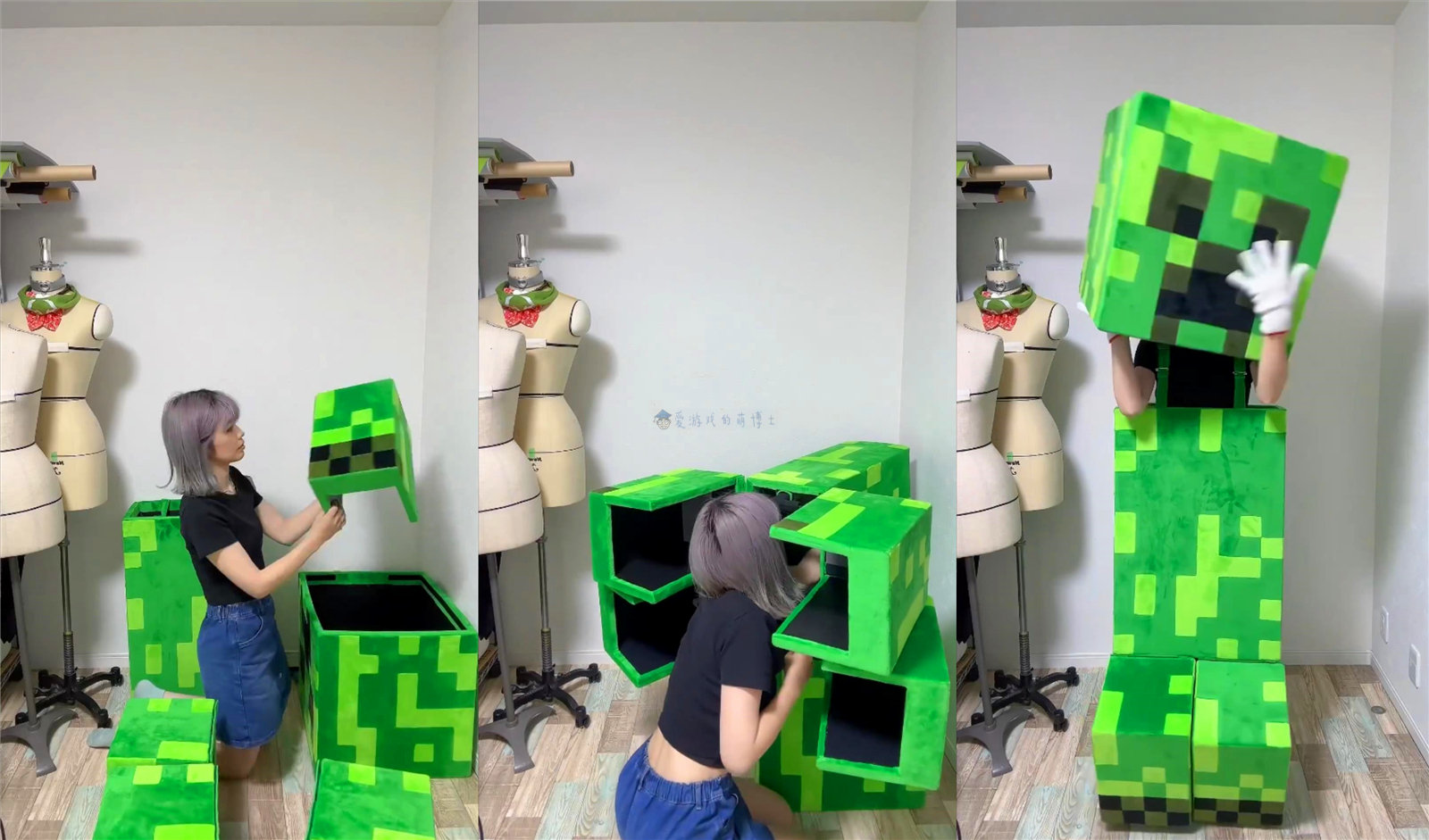 那么,如何把上述这种差异还原出来,正是Coser遇到的最大难题。当然,你如果只是套几个绿色纸箱,硬说自己在Cos苦力怕,那么也达不到“ぽち”的讨论热度。这位小姐姐在制作的过程中,在苦力怕的腿部设计了可动机关,让其行走起来和游戏里的移动动作一模一样,让人啧啧称奇!博士给大家截了图,大家一看就知道这个还原度有多高了。