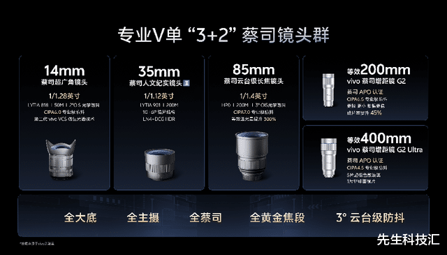 X300 Ultra延续相机经典"大三元"镜头和14mm、35mm、85mm三大黄金焦段思路。14mm蔡司超广角拥有1/1.28英寸超大底,防抖升级至CIPA6.0,等效进光量提升100%。第二代35mm蔡司人文纪实镜头采用全球首发蓝图×索尼LYTIA-901传感器,单像素感光面积提升30%,是全球唯一的35mm搭配2亿超清像素组合。