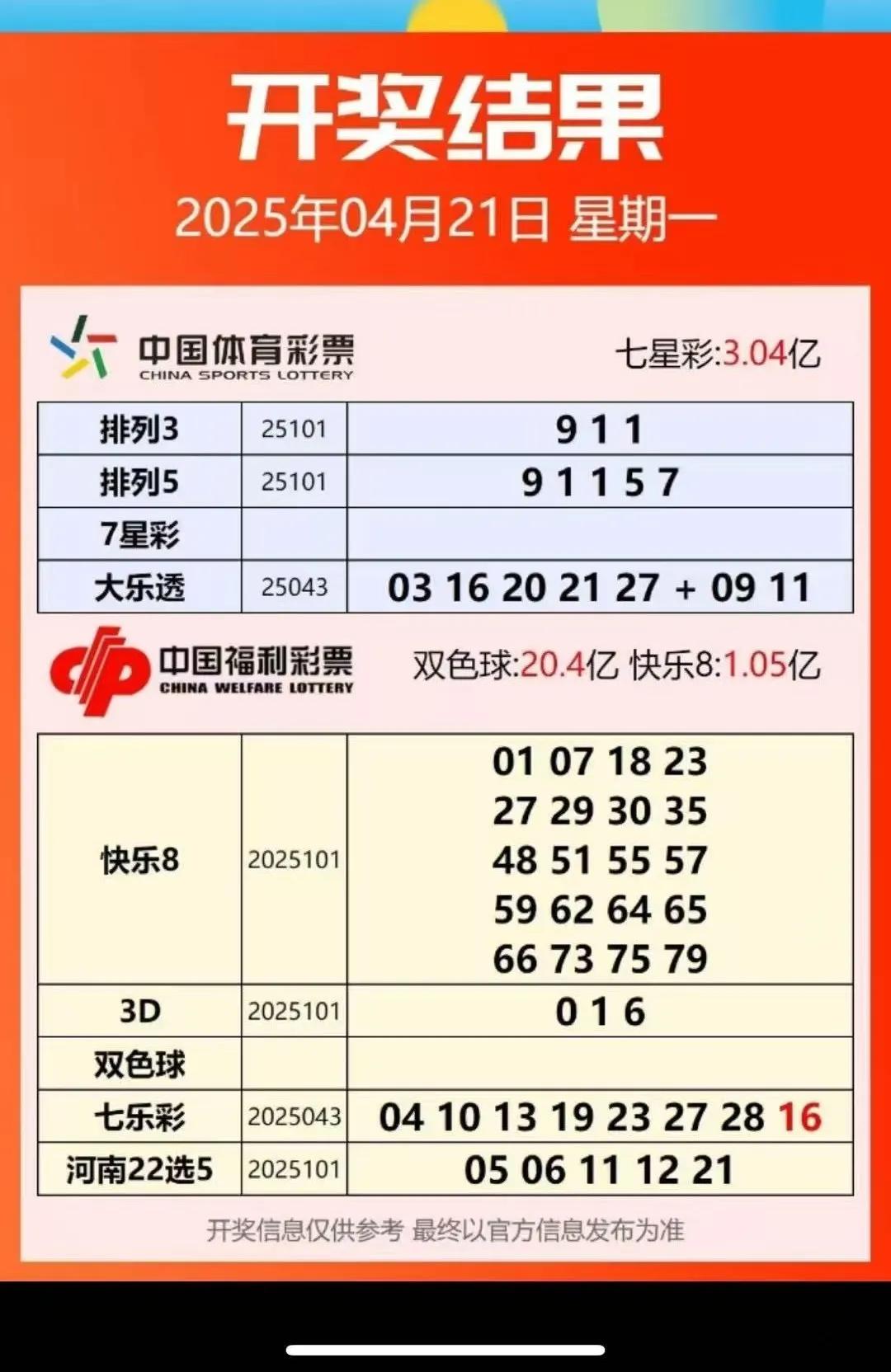 4月21号星期一,大乐透开奖号码:03、16、20、21、27—09、11。本期大乐透开奖号码前区红球开出了一组连号20、21号,开出了一枚重号20号,后区蓝球开出了奇数组合09、11号其中11号连续三期开出。 本期大乐透开奖号码大中小区号码都有,整体上难度一般般。一等奖仅开出2注,单注奖金1000万元,追加一等奖开出1注,单注奖金800万元。一等奖:安徽中得一注基本一等奖,江苏中得一注追加一等奖。要中大奖了吗 全民中奖时代