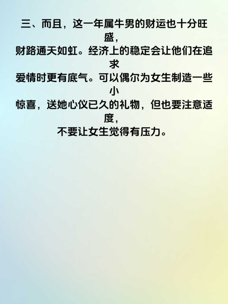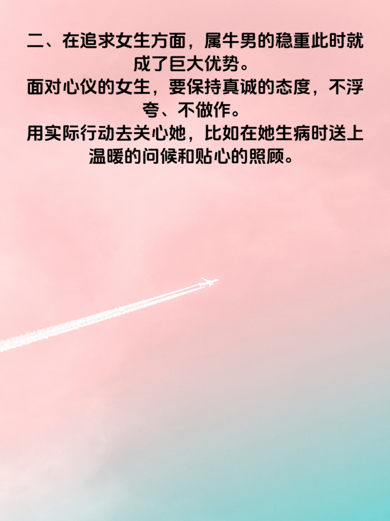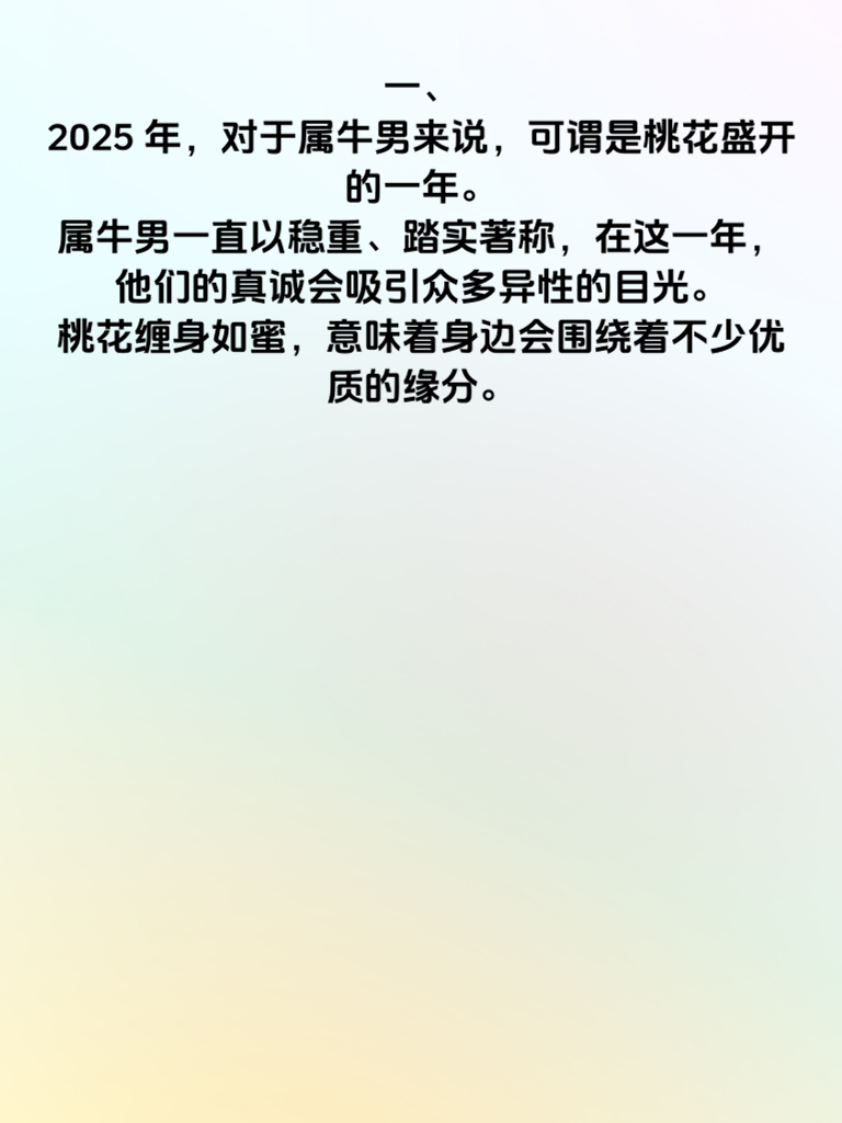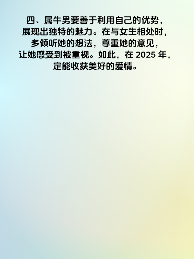一、2025 年,对于属牛男来说,可谓是桃花盛开的一年。属牛男一直以稳重、踏实著称,在这一年,他们的真诚会吸引众多异性的目光。桃花缠身如蜜,意味着身边会围绕着不少优质的缘分。 二、在追求女生方面,属牛男的稳重此时就成了巨大优势。面对心仪的女生,要保持真诚的态度,不浮夸、不做作。用实际行动去关心她,比如在她生病时送上温暖的问候和贴心的照顾。 三、而且,这一年属牛男的财运也十分旺盛,财路通天如虹。经济上的稳定会让他们在追求爱情时更有底气。可以偶尔为女生制造一些小惊喜,送她心仪已久的礼物,但也要注意适度,不要让女生觉得有压力。 四、属牛男要善于利用自己的优势,展现出独特的魅力。在与女生相处时,多倾听她的想法,尊重她的意见,让她感受到被重视。如此,在 2025 年,定能收获美好的爱情。