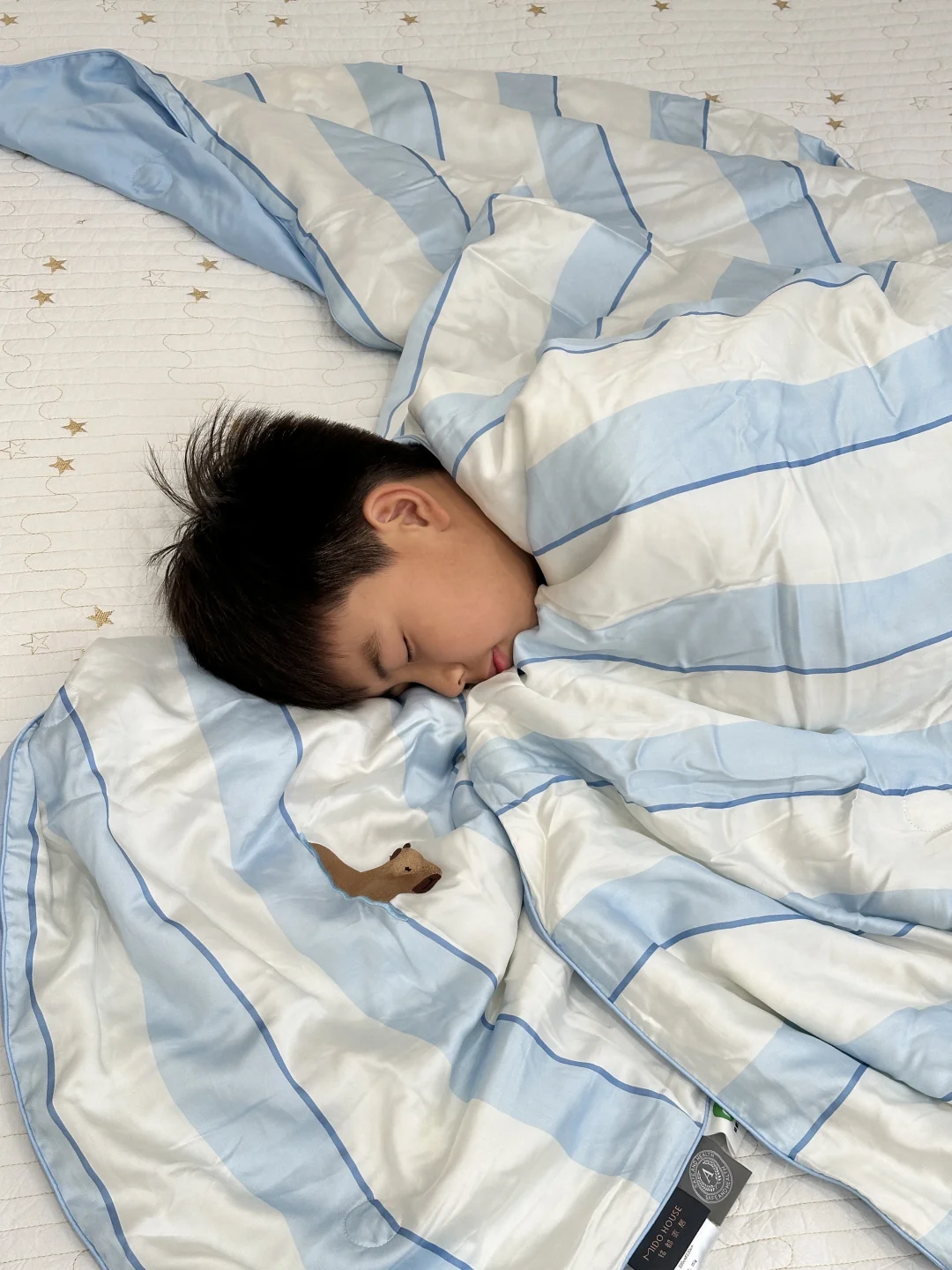 我家十岁小孩哥的独立空间是极简风,不到10㎡的小房间应有具有,睡眠区,学习区,储物区,玩乐区,这个秘密基地应该可以用到成年~ 床垫直接放在地毯上,可随小盆友心情随意改变放置的方向,最近天气渐热,给小盆友准备了铭都宝贝可水洗蚕丝夏被,这个夏凉被盖上冰冰凉凉的,而且很丝滑,蓝白条纹➕卡皮巴拉的图案,可把小孩哥高兴坏了,迫不及待的要躺上去体验一下~ 内里是百分百天然纯蚕丝,更加吸汗透气不闷热,还可以机洗,懒妈的最爱~
