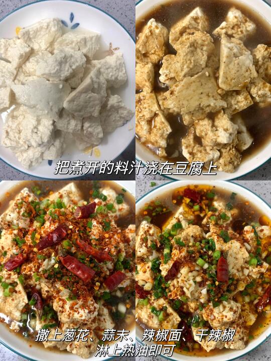4⃣️把烧开的料汁浇在豆腐上,撒上葱花、蒜末、辣椒面、干辣椒,淋上热油即可~