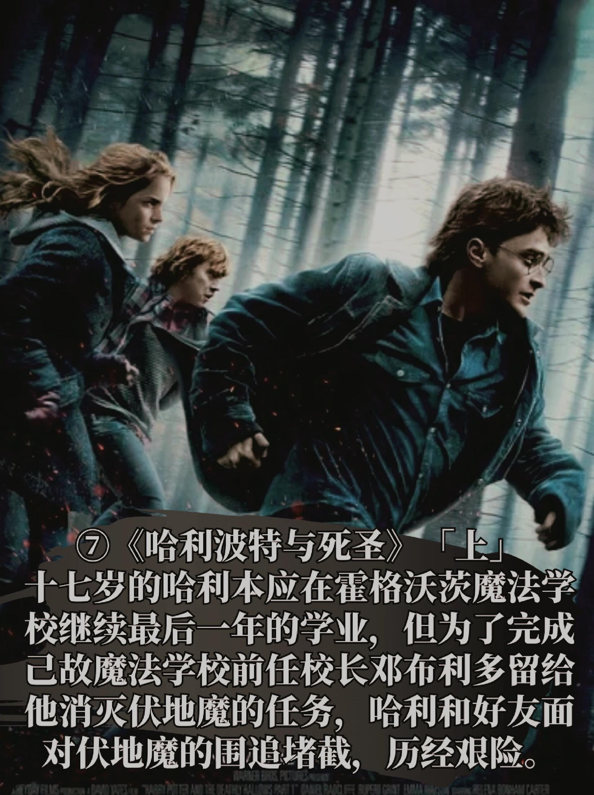 《哈利波特》正确观影顺序!!!霍格沃兹梦开始的地方!其中①-⑥部讲年轻的巫师学生哈利波特在霍格沃兹魔法学校前后6年学习生活与冒险故事。第⑦部讲哈利波特在第二次巫师大战中被迫逃亡在外寻找魂器并消灭伏地魔的故事。中传爆改霍格沃茨