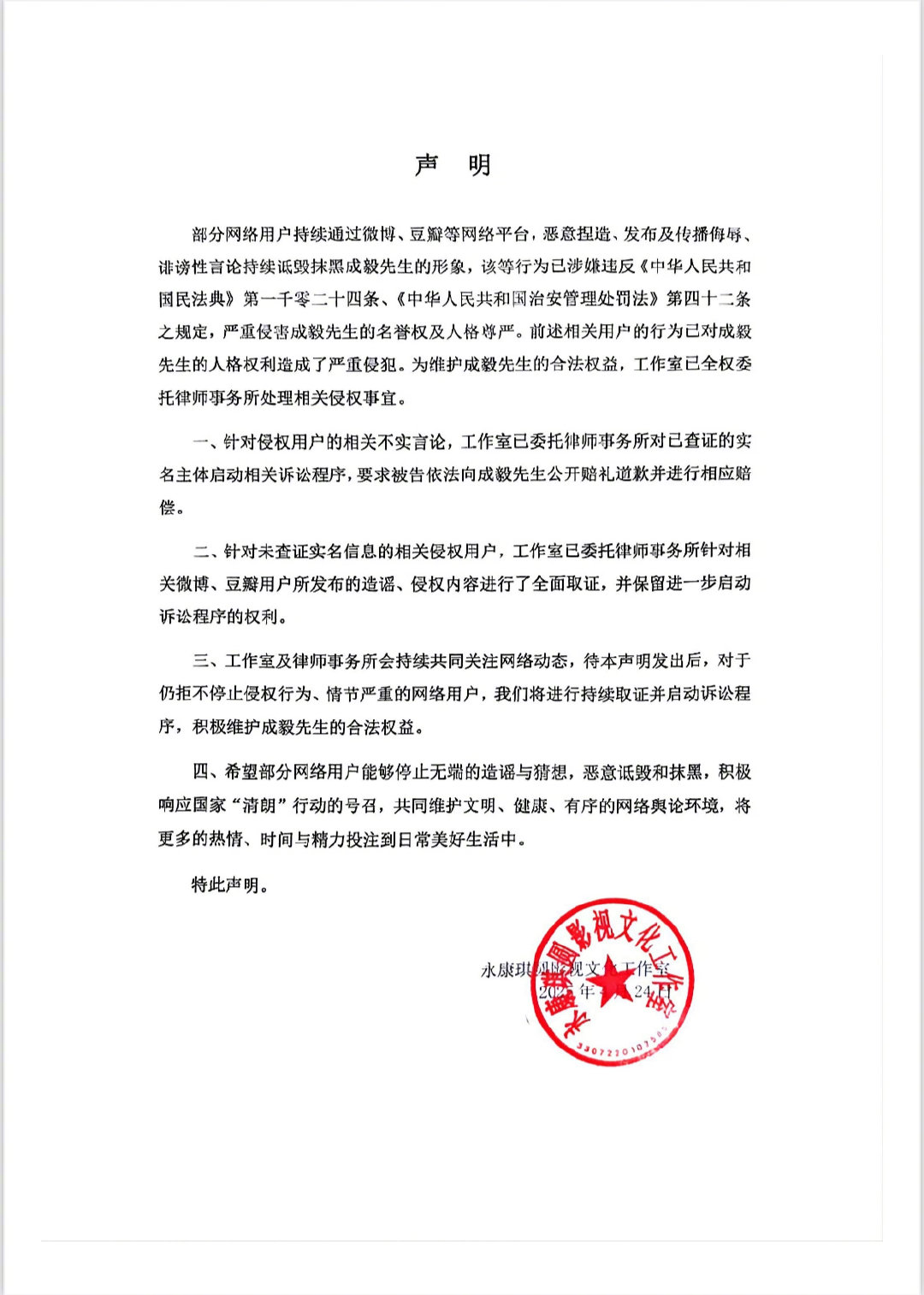 工作室在声明中呼吁部分网络用户停止无端造谣、恶意诋毁行为,积极响应国家“清朗”行动号召,共同营造文明、健康、有序的网络舆论环境,将更多精力投入到日常生活中。