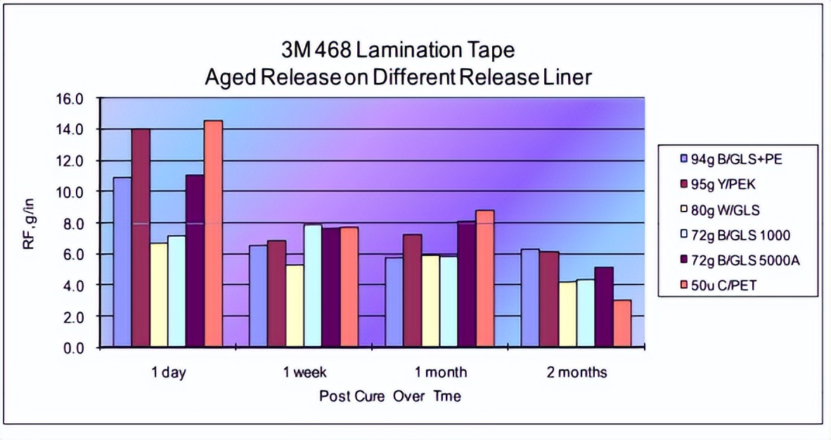而贴合后的产品,随着时间推移,也会发生变化。以3M的468纯胶膜胶带为胶,贴合不同型号的离型纸,离型力会下降。当然也不是所有的都是下降,事实上,很多产品贴合胶以后,经过高温高湿以后,因为胶充分浸润了离型纸表面,粘性大幅增强,离型力会明显上升。