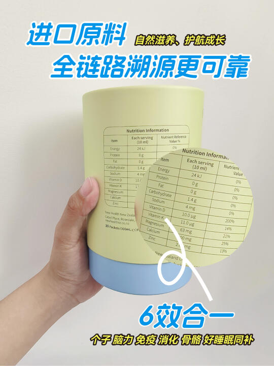以前试过各种钙剂总被吐出来,这个新西兰实验室研发的配方确实不一样!柠檬酸钙镁+维D3/K2黄金组合,像给骨骼装了导航系统🧭每天两条就能补足钙镁锌(特意查了每包含200mg钙)。最惊喜是坚持吃后娃的夜醒次数减少了,甚至能一夜睡到天亮了。睡觉也不会再趴着睡了~