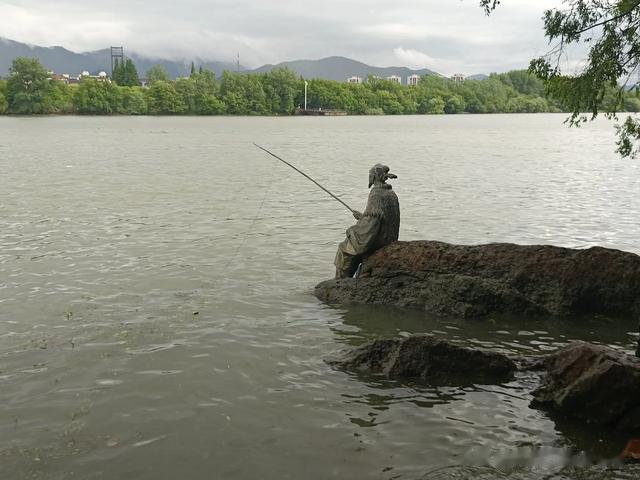 鹲山公园面积不大。公园中著名的标志景点是严子陵钓鱼处。相传严子陵钓鱼处有三个地方,富阳鹳山是其中之一。我是奔着这个景点来的,而且真的找到了。富春江边一座亭子,亭子下面是延伸入江中的一块大石头。大石头上还有一位钓鱼人,不过是一个穿着塑料雨衣的光头中年男子。显然与严子陵相去甚远。实际上严子陵钓鱼台在旁边。石壁上镌刻着“登云钓月”四个大字,落款是苏轼。钓鱼台上有一座严子陵身披蓑衣的雕塑。手持鱼竿,做沉思状。富春江水在风雨中波涛汹涌,严子陵沉思了两千年。历史上对严子陵的评价褒贬不一,褒多贬少。和东汉光武帝刘秀是发小,自身又有韬略才华。但是绝不趋炎附势,隐入风尘,与山林共老。可谓品德高洁之士。持不同意见的也有。比如宋代一位无名氏,写了一首讽刺诗流传到现在。
