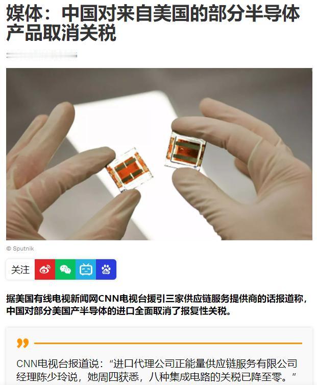 这次球又踢给了美国,就看美国接不接!4月25日,外媒最新报道称,中国对部分美国产半导体的进口全面取消了关税。知情人士称,八种集成电路的关税已降至零。外媒表示,中国作出的这一举动,这是对美国4月13日宣布豁免包括手机,笔记本,半导体制造设备零件的对等回应。 这里面的门道可不简单。首先,美国豁免的是中国组装的终端产品,比如 iPhone、笔记本电脑,但这些产品的核心零部件如芯片、存储颗粒大多还是美国企业生产的。 中国这次直接对美国产的八种集成电路开刀,表面上看是 “对等回应”,实际上是精准打击了美国半导体产业的命门。 比如英伟达的 GPU、美光的存储芯片、德州仪器的模拟芯片,这些产品长期占据中国市场,关税归零后价格优势更明显,短期内确实能让美国企业赚得盆满钵满。 但美国企业很快就会发现,这其实是个 “甜蜜的陷阱”。中国取消关税的八种集成电路,恰好是中国正在突破的关键领域。 比如逻辑芯片、存储芯片、传感器等,国内企业已经在 28 纳米以上成熟制程实现量产,关税归零后美国产品涌入,反而会挤压国产替代的空间。 但中国这招更高明的地方在于,通过降低关税让美国企业依赖中国市场,同时加速国产技术迭代。等中国在这些领域实现自主化,美国企业将面临更大的市场份额流失。 更关键的是,美国的关税豁免政策存在严重漏洞。根据美国海关的规定,中国原产的产品仍需缴纳 125% 的关税,但如果是美国企业在中国工厂生产的产品,则可以享受豁免。 这就导致一个滑稽的局面:苹果在中国组装的 iPhone 可以免税进入美国,但富士康使用的美国产芯片却要被加征关税。 中国这次直接对美国产芯片取消关税,实际上是在帮美国企业绕过特朗普政府的 “自杀式政策”,让美国企业在中国市场的利益最大化,同时也让美国政府陷入两难境地。 美国现在面临的问题是,继续加征关税会损害本国企业利益,尤其是半导体行业已经因为关税损失超过 10 亿美元;但如果全面取消关税,又会被视为对华软弱,影响其 “强硬” 形象。 更要命的是,中国在半导体领域的自主化进程正在加速,新凯来等企业已经推出覆盖全流程的半导体设备,成熟制程产能占全球 28%,这让美国的技术封锁越来越失效。 这场博弈的本质,是中国用市场化手段破解美国的政治操弄。美国试图通过关税战遏制中国科技发展,但中国通过精准调整关税,既缓解了国内供应链压力,又分化了美国企业与政府的关系。 现在球踢回给美国,就看他们敢不敢接 —— 继续加码关税,只会让更多美国企业倒向中国;全面妥协,则意味着 “印太战略” 彻底破产。无论怎么选,美国都将付出更大代价,而中国在半导体领域的主动权正在不断扩大。
