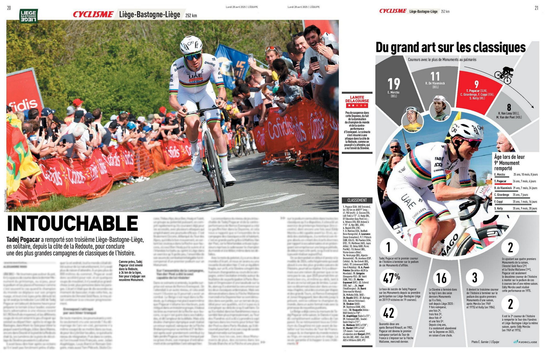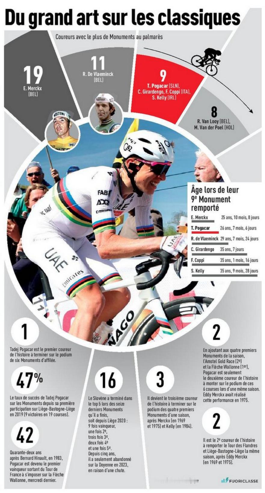 今日队报封面:遥遥领先(Très loin devant)。还吹波加查昨天的表现“无人能及”,是史上最伟大的表现之一。而范德普尔是整个春天唯一能给他制造麻烦的人,还列出波加查各种数据,9个五大,过去六个五大他都登上了领奖台,职业生涯五大古典赛47%的胜率,获得9个五大第二年轻等...