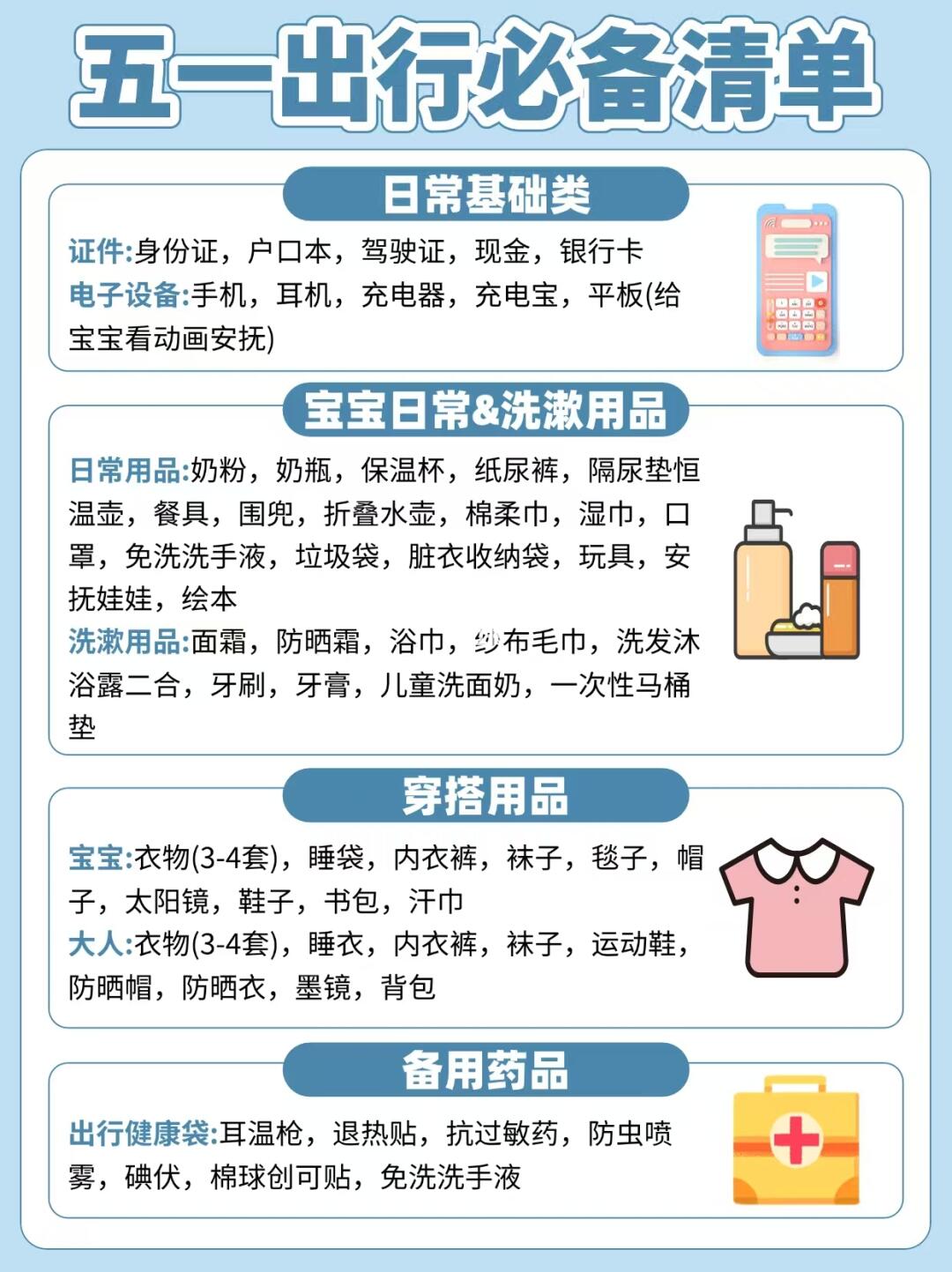 🌟五一出行必备清单来啦!小长假即将来临,小伙伴们是不是已经按捺不住激动的心情了呢?😎但是出门在外,有些东西可是必不可少的哦!接下来就给大家科普一下五一出行的必备清单吧~💼🎒 🌞防晒用品:不管你是去海边还是山间,防晒霜都是必需品!可以选择SPF50+的,防晒效果更佳哦~还有遮阳帽👒、墨镜🕶️、防晒衣等都可以安排上。 💦补水保湿品:旅途中皮肤容易干燥缺水,记得带上面膜🧦和保湿喷雾呀。随时给肌肤补充水分,保持水润润的状态~ emedicines药品:创可贴🩹、感冒药、肠胃药、晕车药等等,以备不时之需。毕竟健康才是愉快旅行的基础嘛! 📷摄影装备:手机📱、相机📸、自拍杆等等,记录下旅途中的美好瞬间,留下珍贵回忆。 🍴饮食相关:便携餐具、保温杯☕、零食包等。自己带餐具既环保又卫生,零食可以避免路上饥饿。 🧳其他物品:转换插头🔌、多功能充电宝🔋、雨伞🌂、 mini手电筒💡等。这些小物件在关键时刻都能派上大用场哦! 最后提醒大家,出行前一定要检查清单,确保所有东西都已打包好。希望这份五一出行必备清单能帮到你们,祝大家都有一个开心难忘的假期呀!🎉🌈