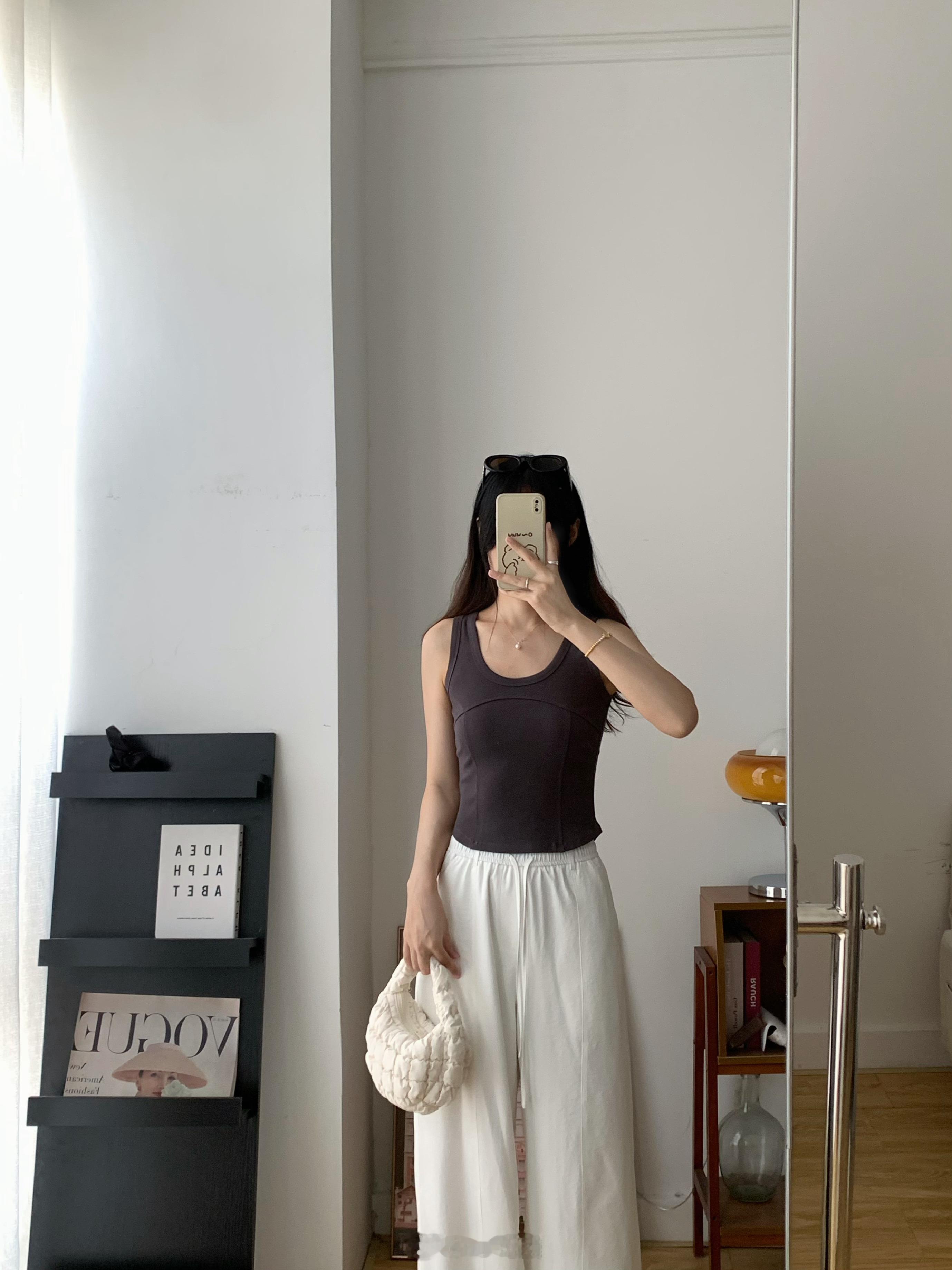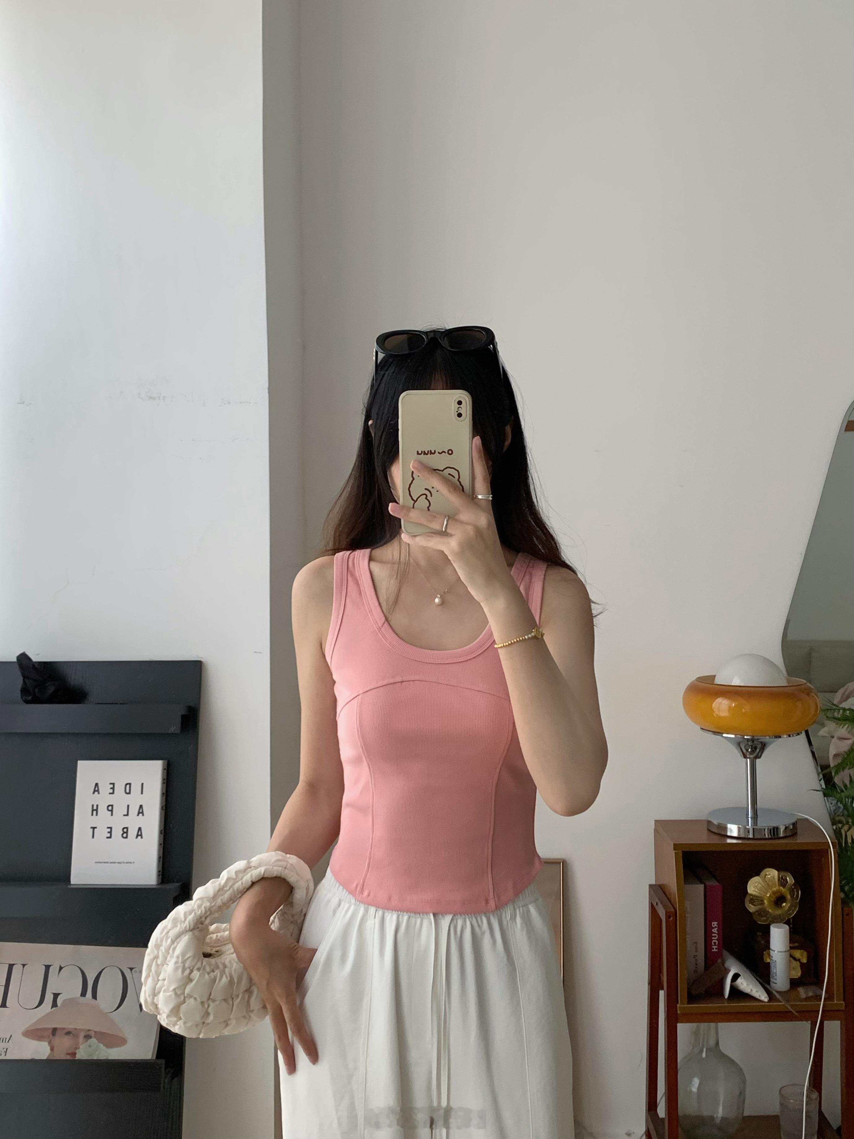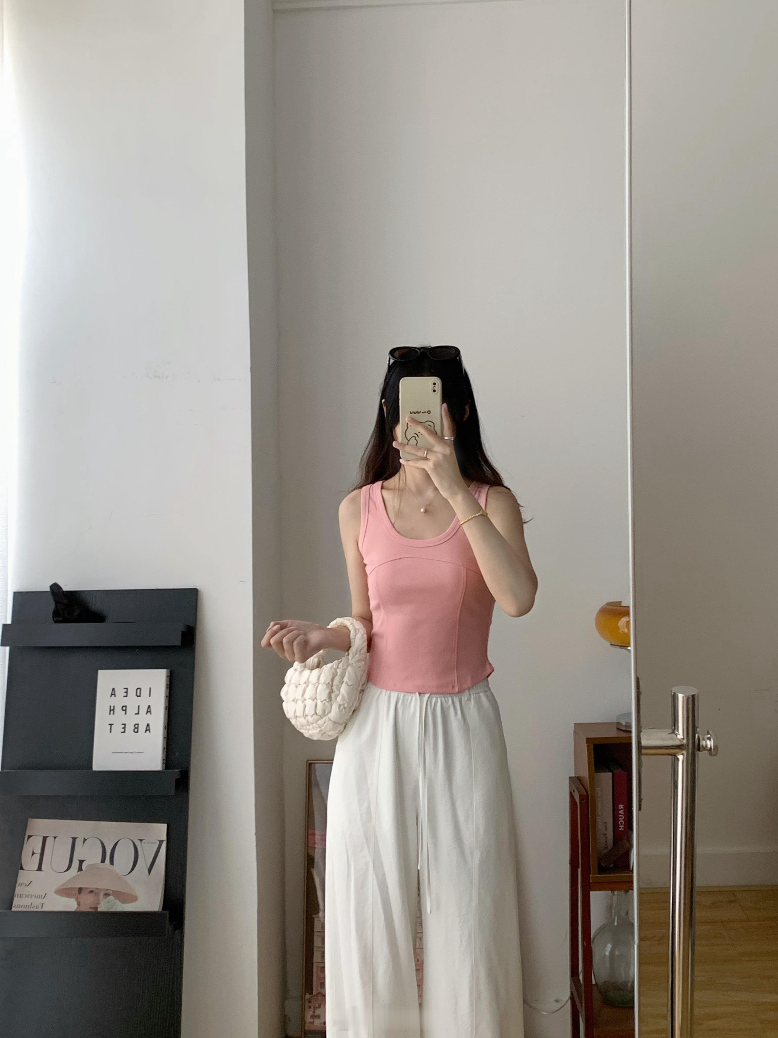 背心领口和袖口全部做了包边,前片砍骨设计,更有层次感,当内搭也不会显得无聊