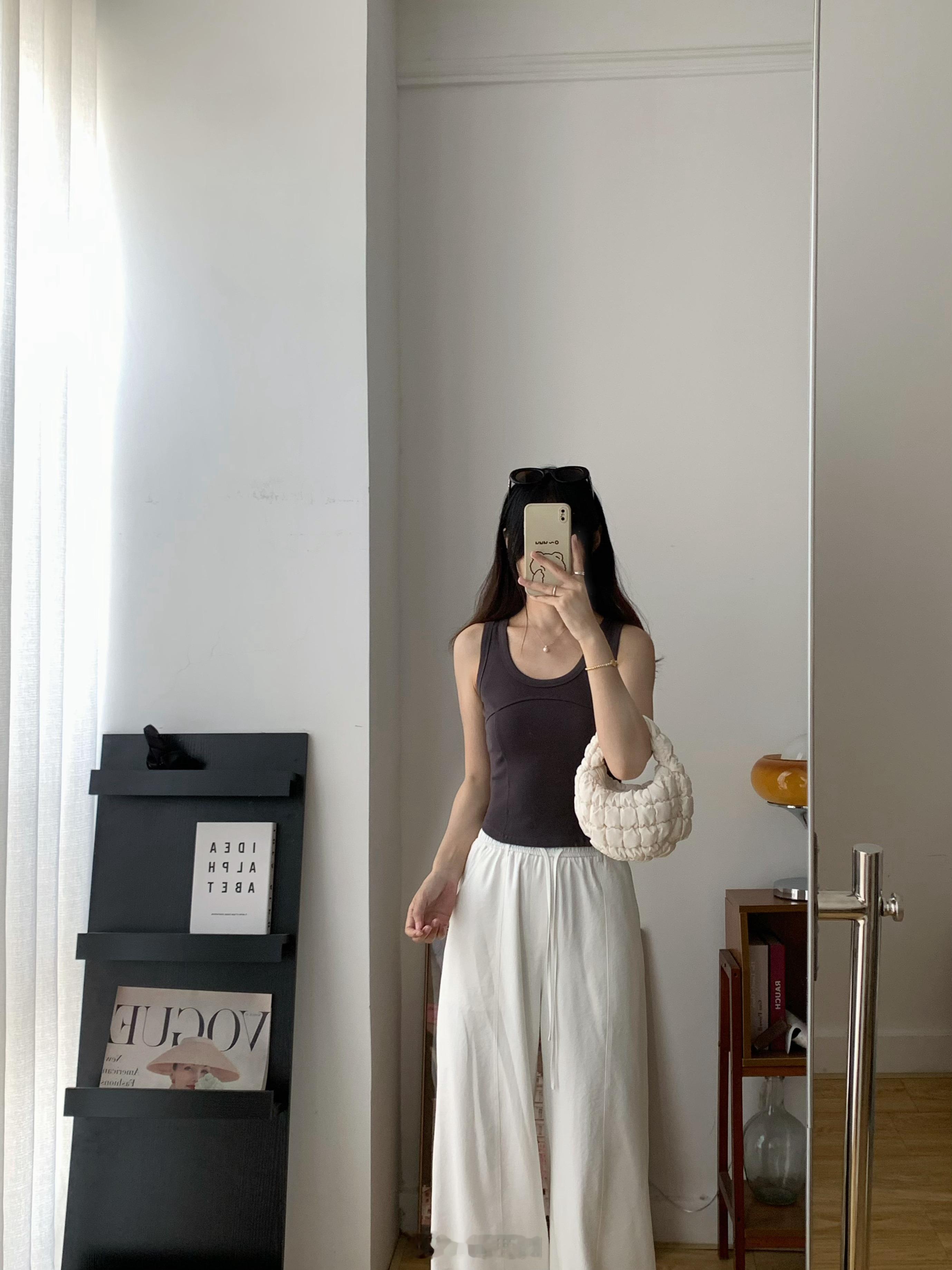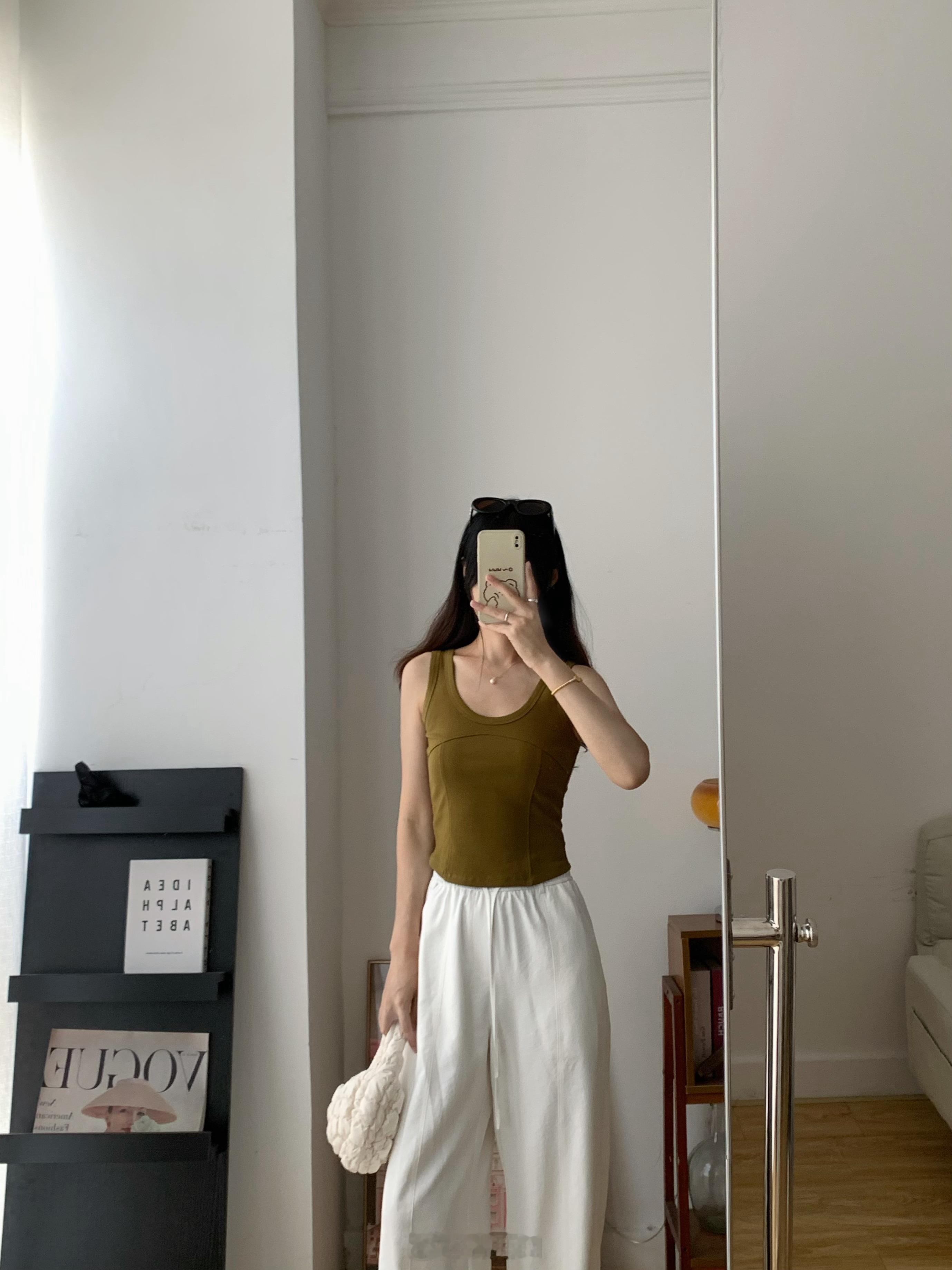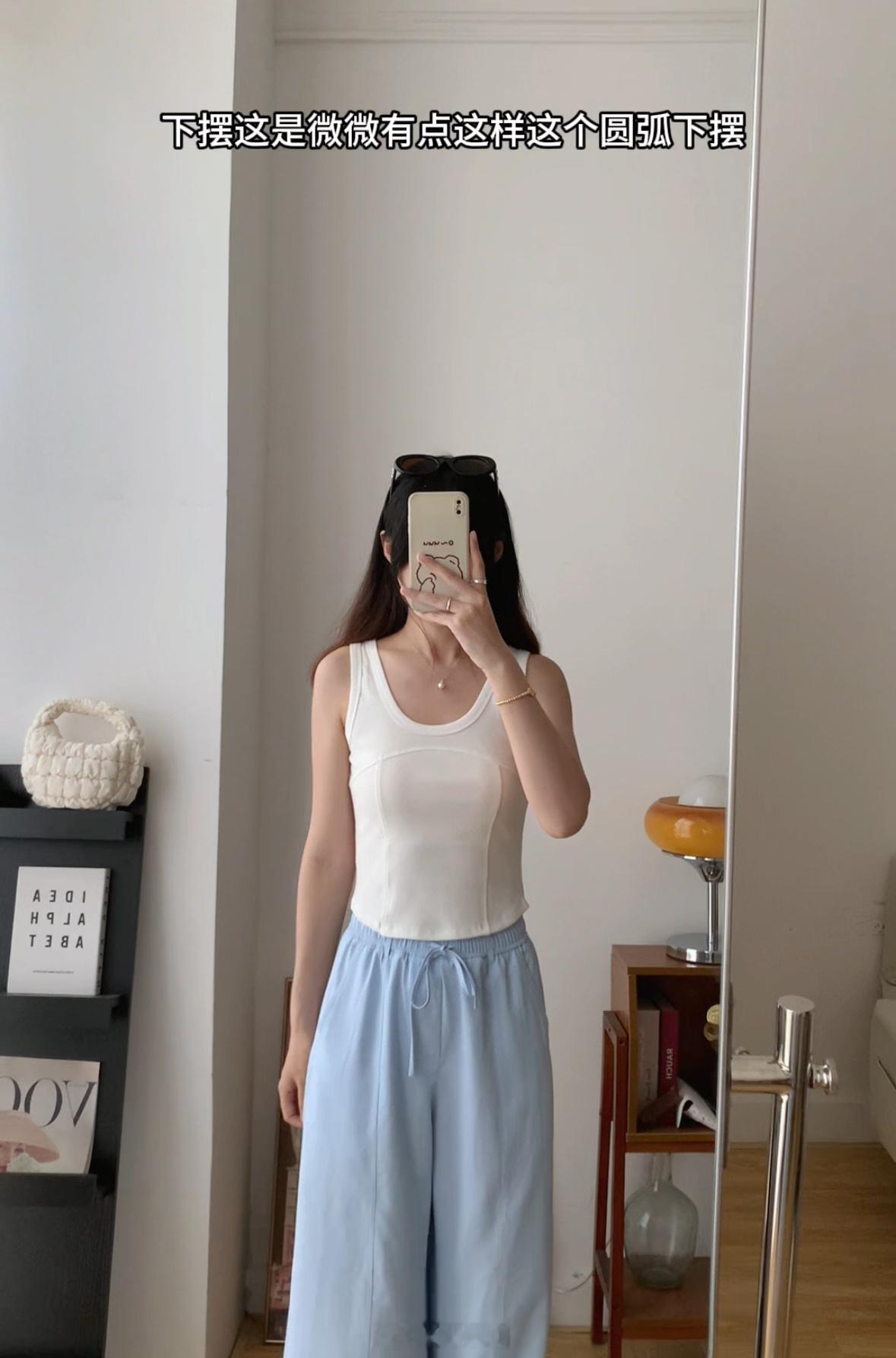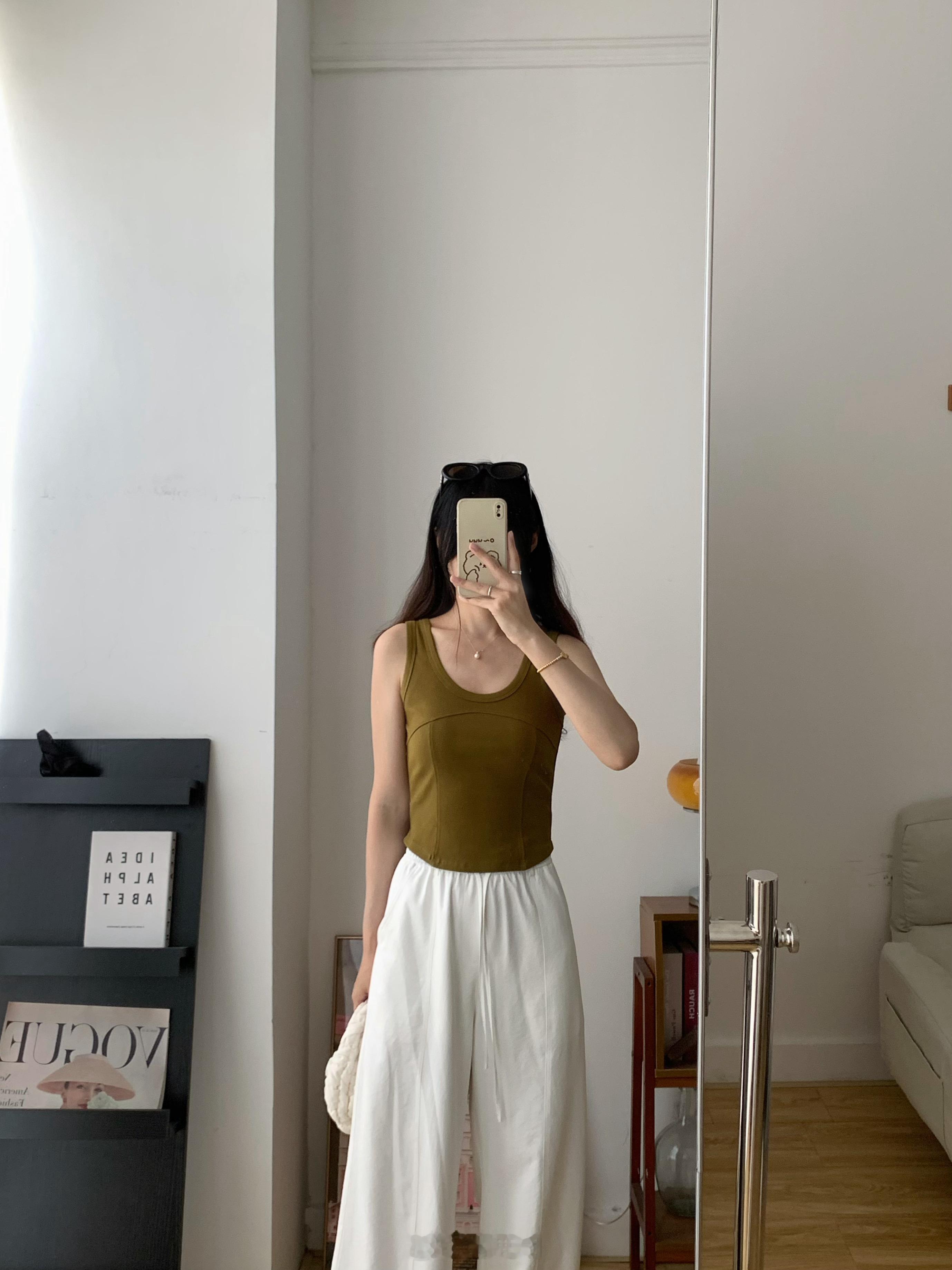 背心领口和袖口全部做了包边,前片砍骨设计,更有层次感,当内搭也不会显得无聊