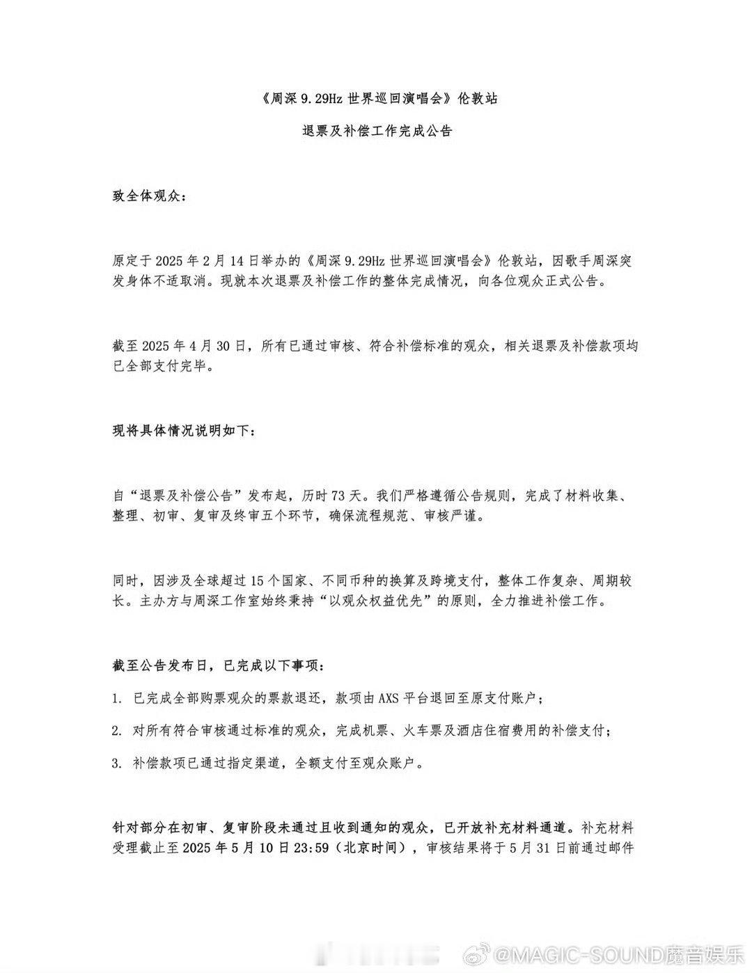 周深伦敦站退票与补偿工作说明周深世巡伦敦站退票与补偿工作说明 关于《周深9.29Hz世界巡回演唱会》 伦敦站退票与补偿工作说明如下