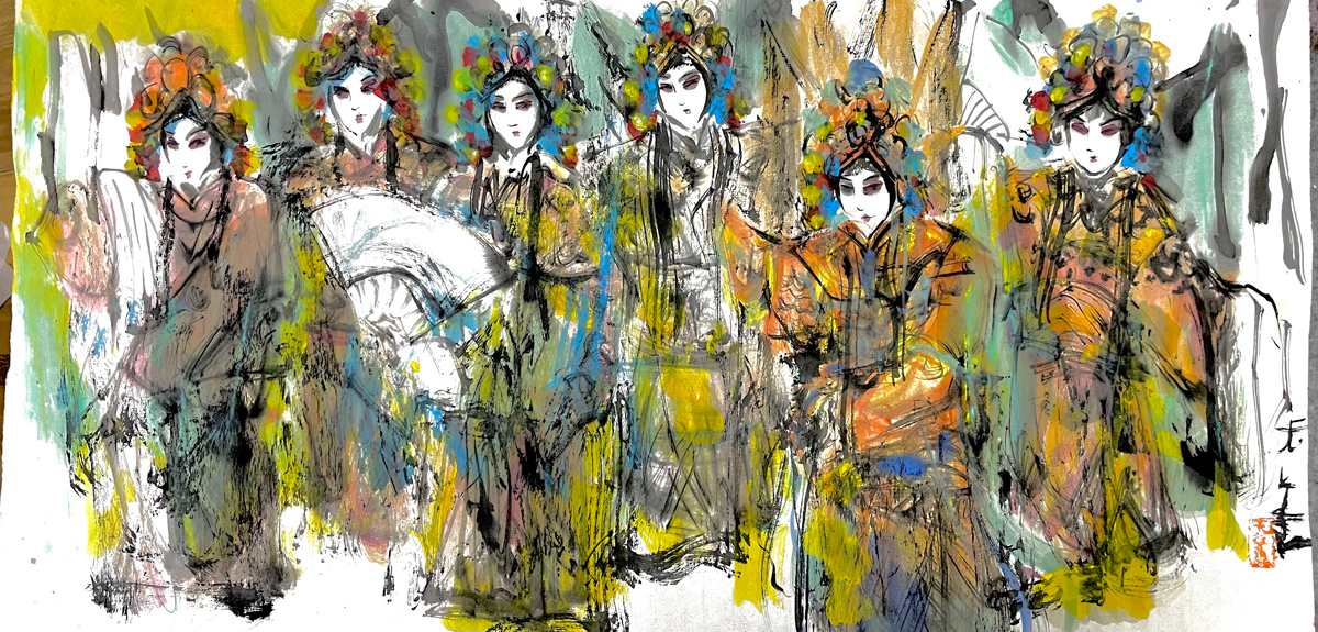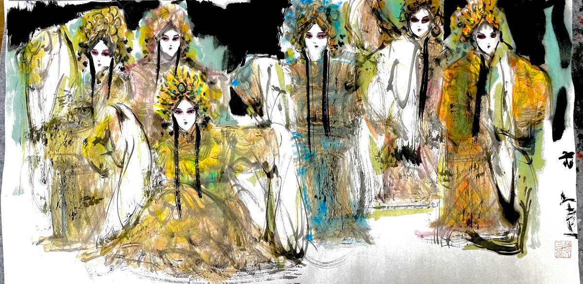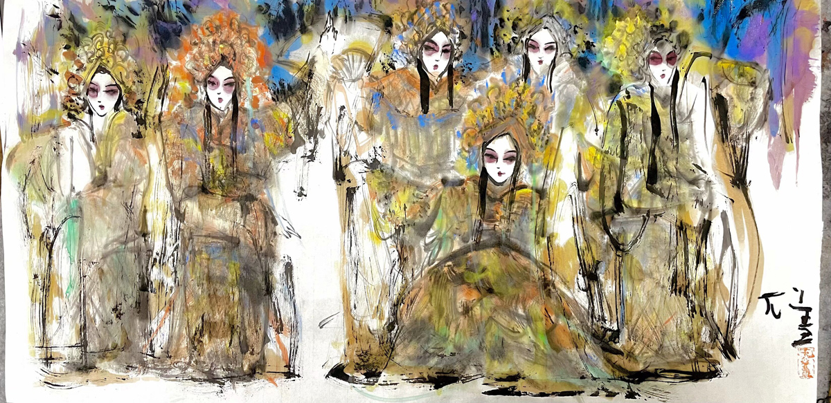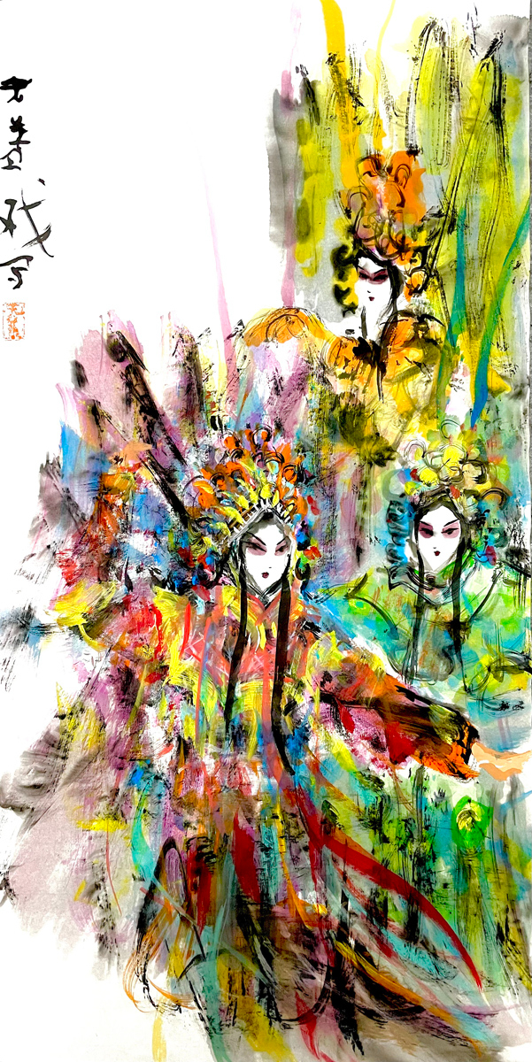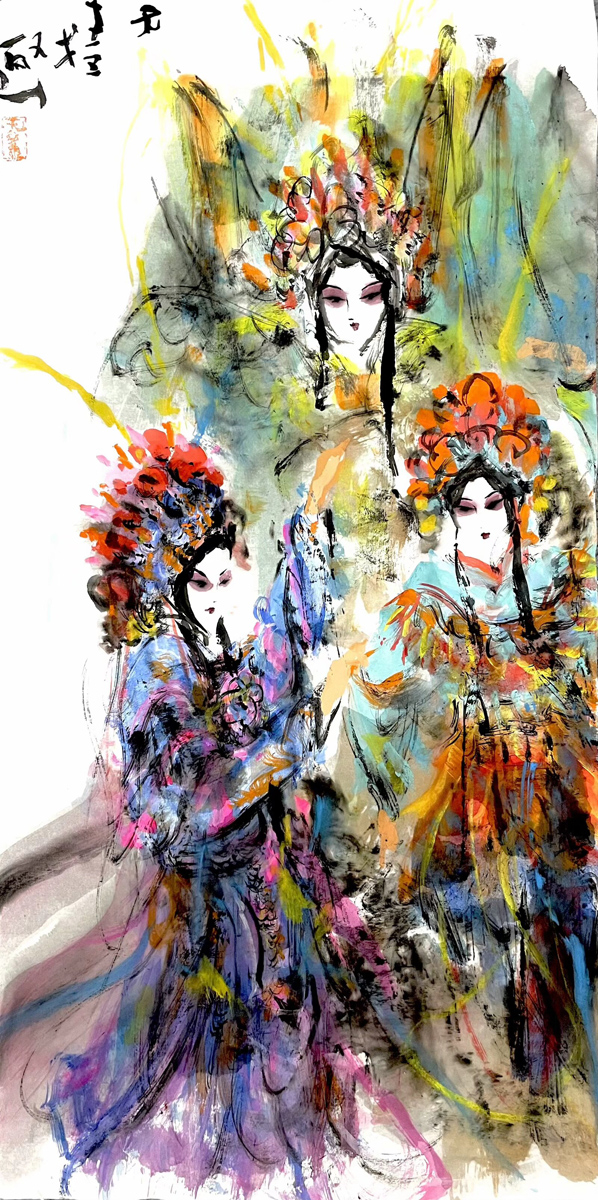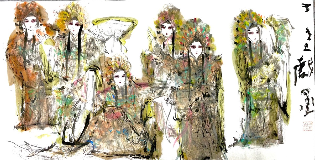 许若文先生以写意笔触勾连古今,笔墨如春风化雨,既见“枯树焕新芽”的生机,又显“白云遮明月”的朦胧。其构图密而不乱,人物如星子散落银河,主次分明却暗藏玄机——居中者如明月高悬,周边人物似众星拱月,形成“月影晨光”般的视觉韵律。色彩运用上,他善用对比:朱红头饰与米黄戏服碰撞,如“春雨逗秋风”般鲜活;墨色与亮色交融,恰似“冬雪戏炎阳”的冷暖交响,既有传统水墨的厚重,又添现代艺术的灵动。