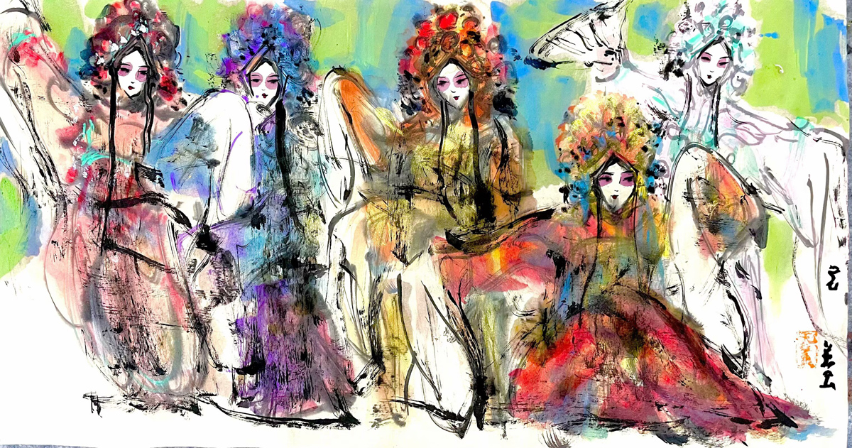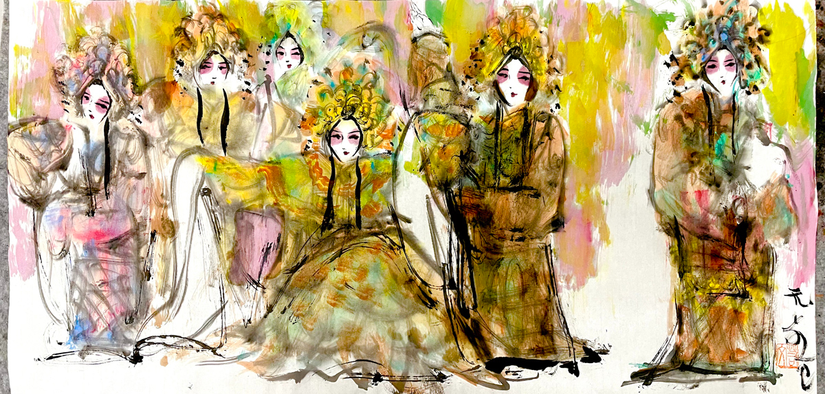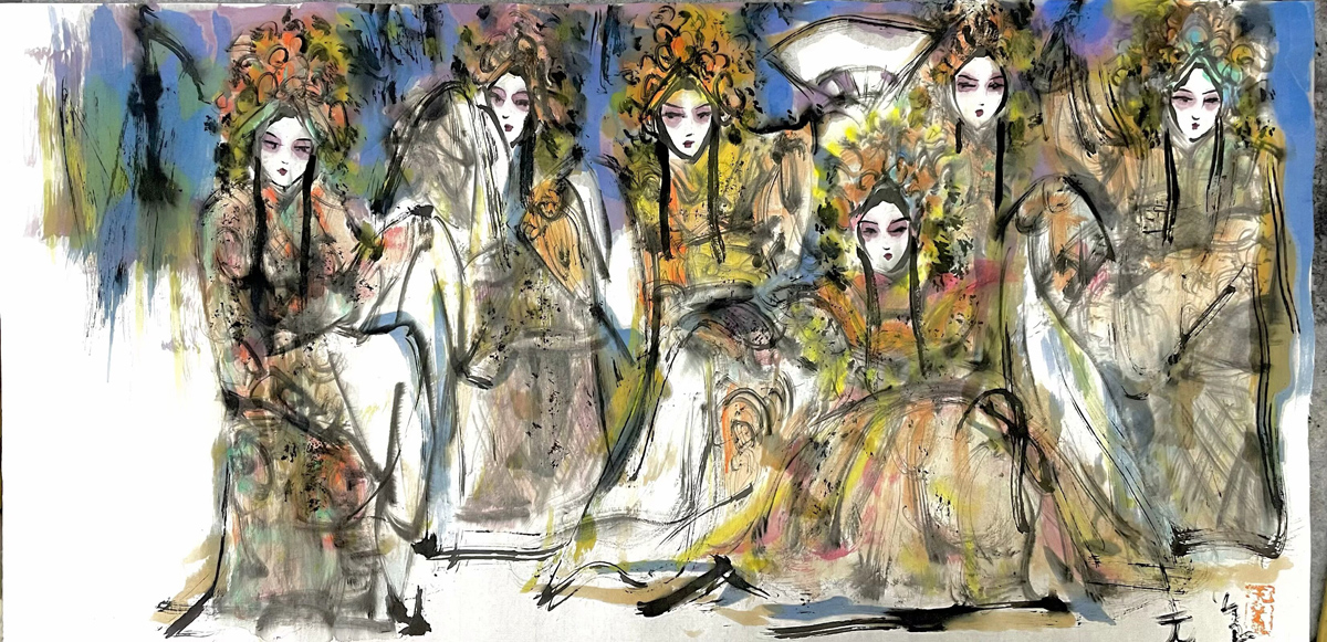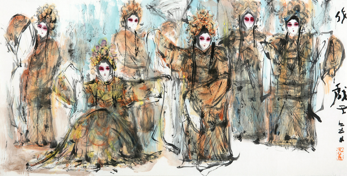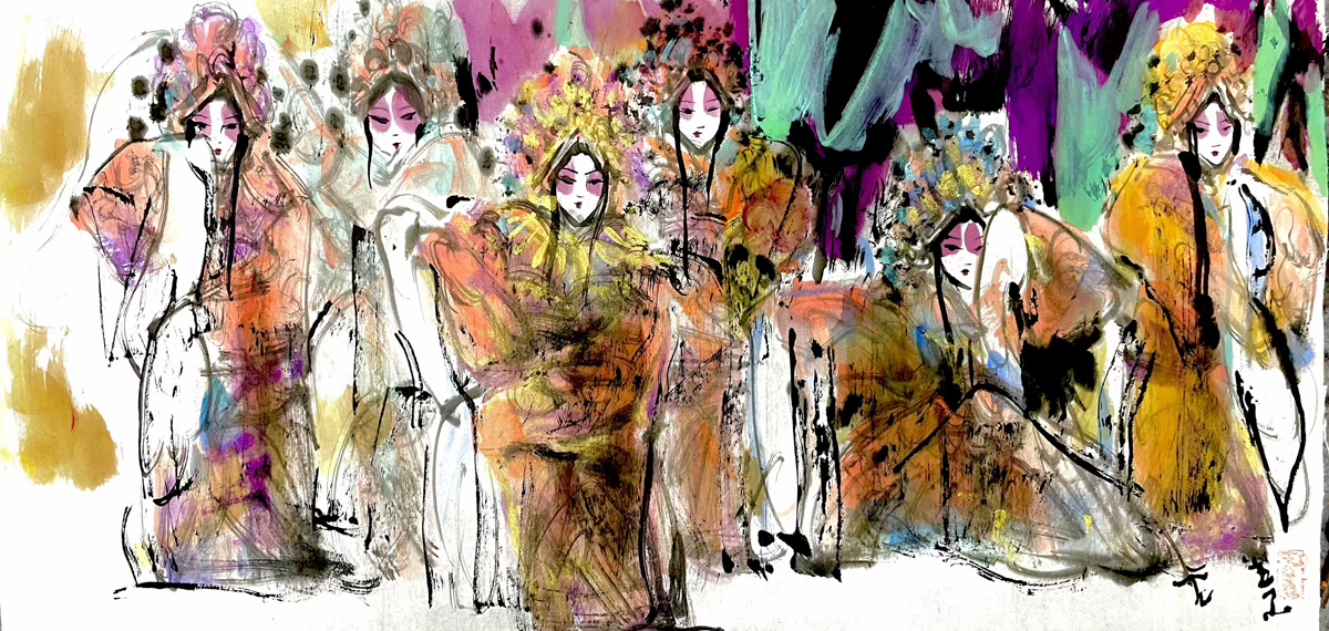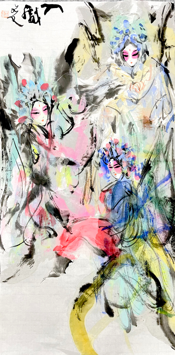 许若文先生以写意笔触勾连古今,笔墨如春风化雨,既见“枯树焕新芽”的生机,又显“白云遮明月”的朦胧。其构图密而不乱,人物如星子散落银河,主次分明却暗藏玄机——居中者如明月高悬,周边人物似众星拱月,形成“月影晨光”般的视觉韵律。色彩运用上,他善用对比:朱红头饰与米黄戏服碰撞,如“春雨逗秋风”般鲜活;墨色与亮色交融,恰似“冬雪戏炎阳”的冷暖交响,既有传统水墨的厚重,又添现代艺术的灵动。