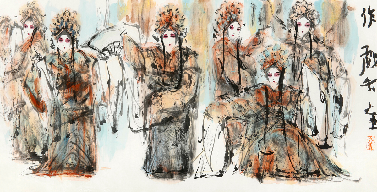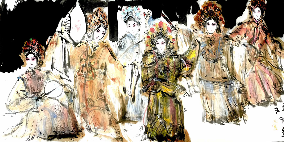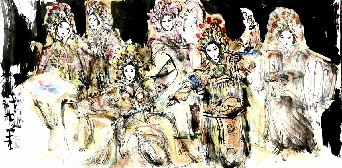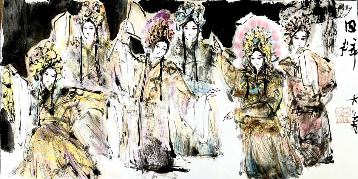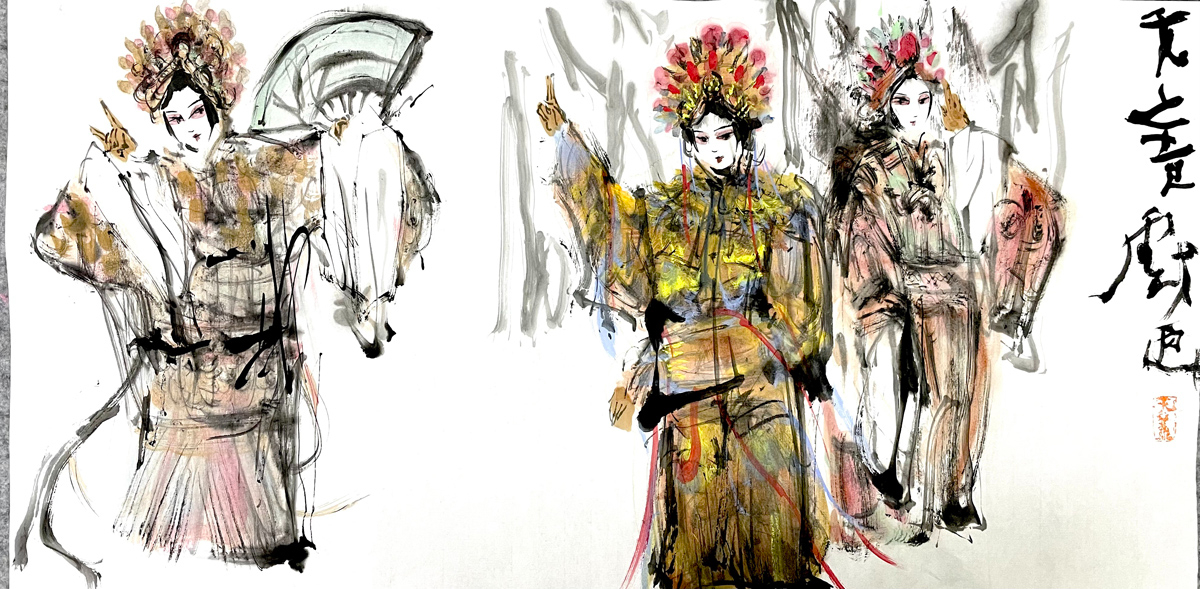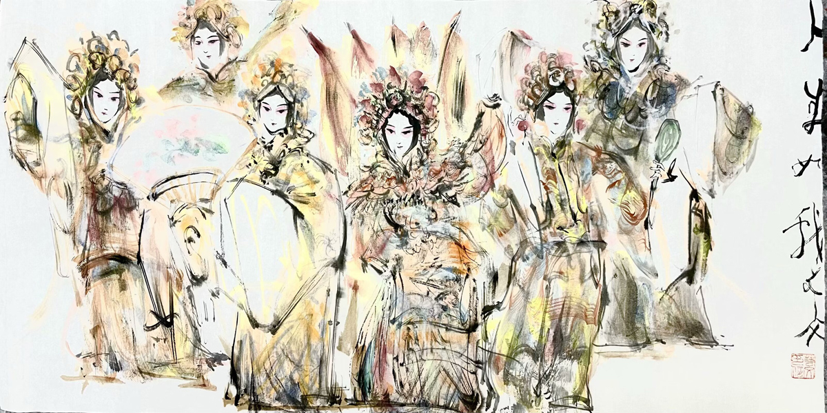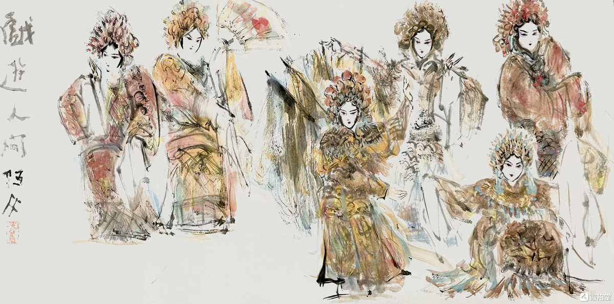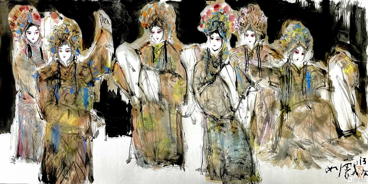 许若文先生的画作,恰似一坛陈年佳酿,未饮先醉。其笔下戏曲人物衣袂翩跹,头饰如金缕玉衣般璀璨,或执扇、或抱琴,眉眼间流转着千年戏韵,恍若“秋为冬穿金缕,冬为春铺素装”的轮回诗意。