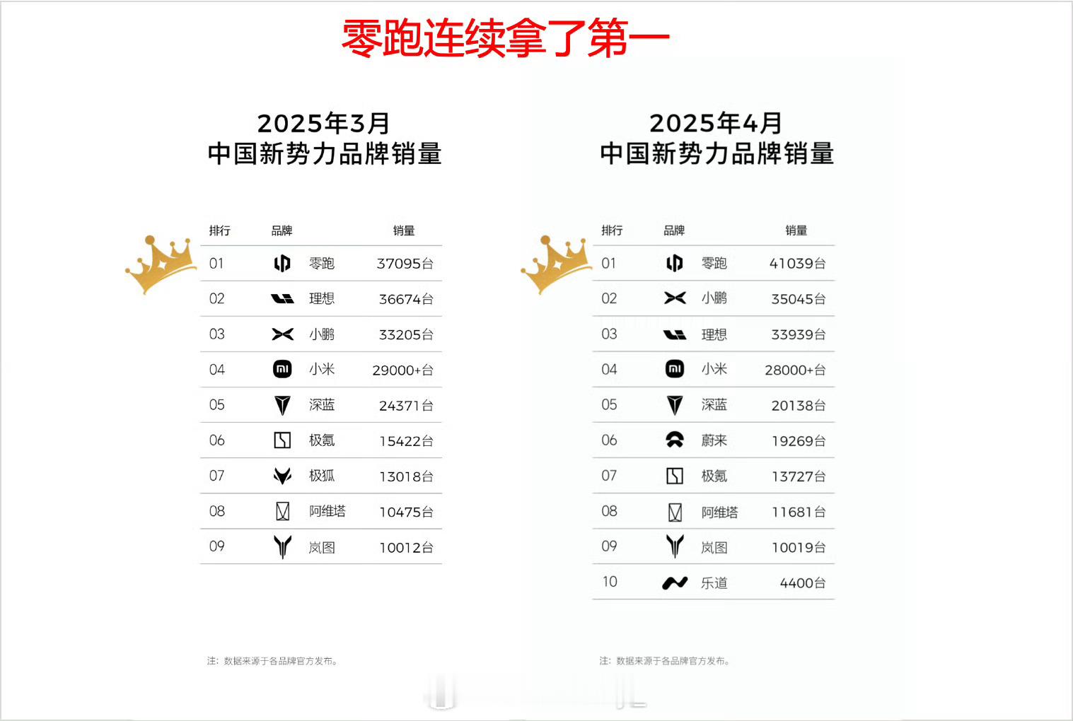 零跑新势力月销量连续第一3月4月连续登顶月度销量冠军,4月月销达41,039台,成为新势力中唯一销量突破4万的品牌,周榜也稳居第一。同比增长173%,环比增长约10%,稳居新势力榜首,也是新势力中唯一破4万品牌!爆款车型C11、C10与B系列的市场热捧,叠加海外市场的强劲增长,形成双轮驱动格局,其“品价比”战略正加速市场占有率提升,零跑时刻已然到来!汽场全开