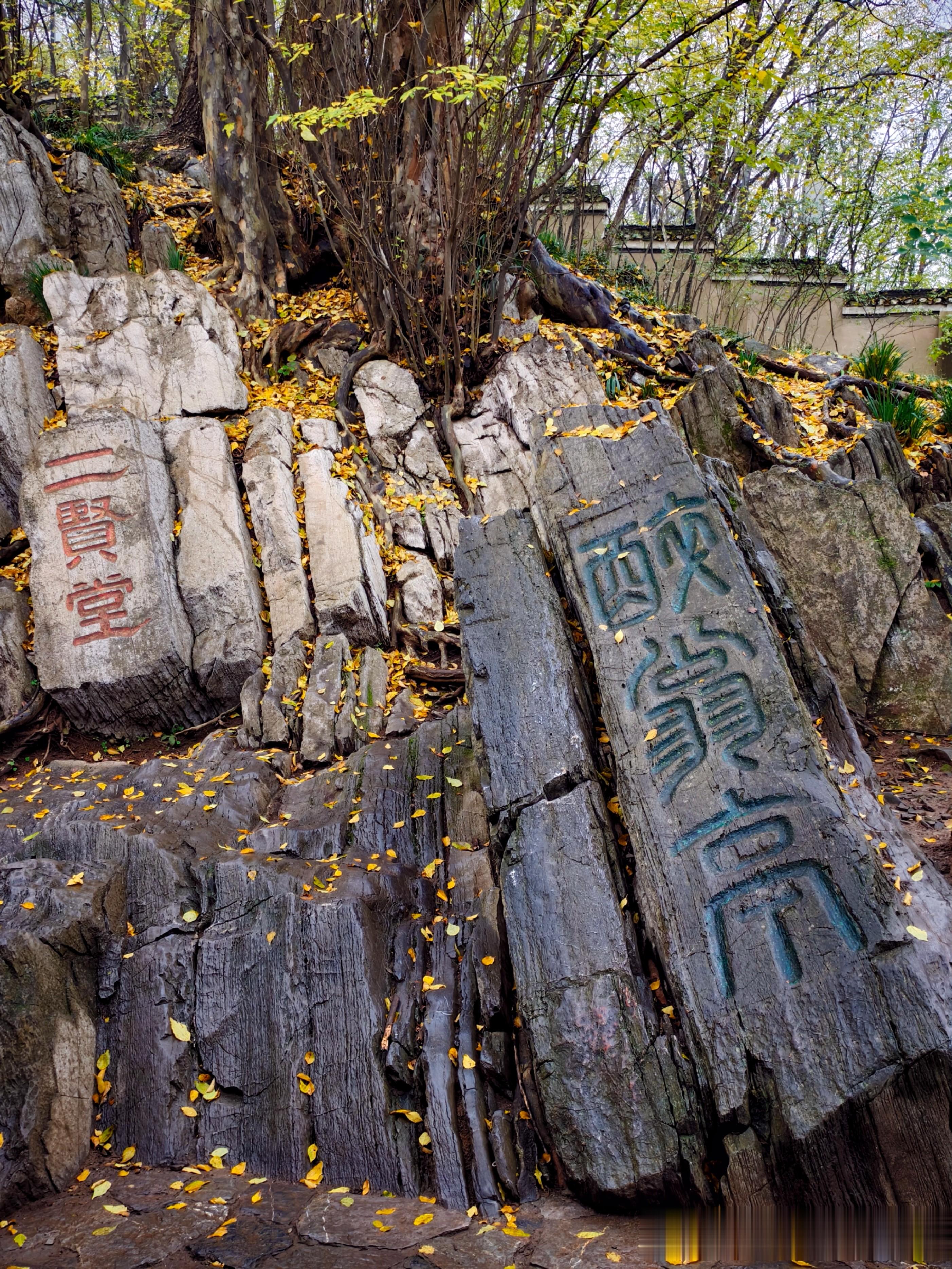 亭东侧山坡上,有宋代“醉翁亭”与“二贤堂”的隶书摩崖题刻。亭北面的二贤堂,是滁人为纪念王禹偁和欧阳修所建。亭南边,有《让泉次韵》、《解酲阁记》和苏茂相题诗碑刻。亭西还有几个曲折连通的小院落,以及宝宋斋、意在亭等建筑。穿行其间,移步易景,尽显江南园林的古雅优美。但若要寻觅“在乎山水之间的醉翁之意”,围墙之外就可以找到。