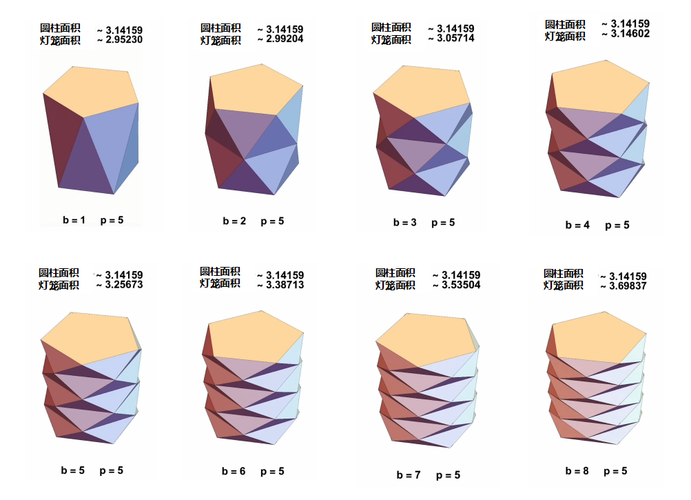 与我们的反例不同,灯笼表面的扭曲完全消失了,这意味着基本上每个小三角形都完全贡献于构成圆柱的面积。通过更详细地分析灯笼的面积公式,我们可以设计出灯笼细化,其面积接近于圆周率和无穷大之间的任何数字。
