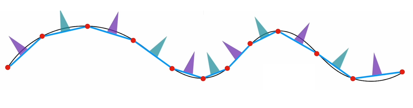 那你会怎样找到曲线的一个好的直线近似呢?首先想到是在曲线上挑几个点,用直线连接它们。然后像这样测量。