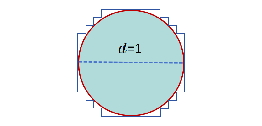 从而将正方形转换成正八边形。由于这种切角操作,得到的八边形周长会小于4,略超过3.31。进一步切割八边形的角形成正16边形,其周长约为3.18多一点。通过继续这样切割角,得到的曲线逐渐逼近圆的形状。与此同时,这些经过切割的曲线的周长也逐步接近圆周率的真实值。由此可见,通过不同的方法近似圆形,可以得到不同的结果。