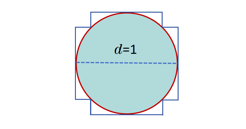 根据数学公式,这个圆的周长应该是圆周率π乘以它的直径,也就是π。接着,我们在这个圆周围画一个边长等于圆直径的正方形。