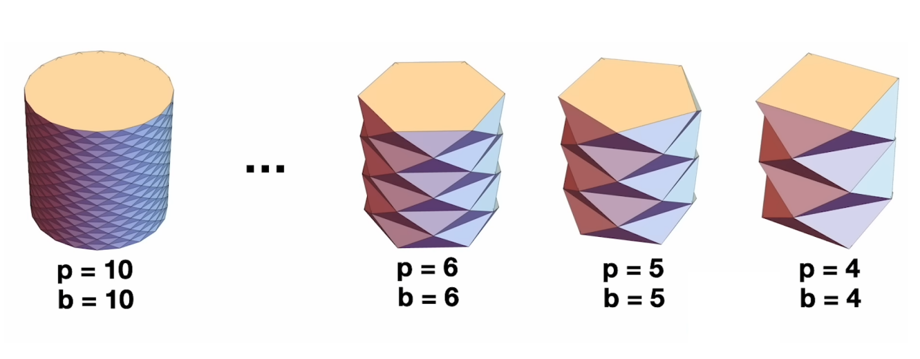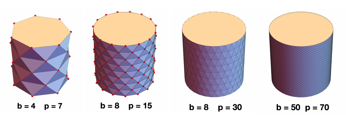 然后是p=7等等。现在,这种特殊的三角形细化满足了我们所有的条件。点数和带数都无限增加。这意味着三角形的边缘会缩小到零。因为边缘缩小到零,灯笼的近似确实变得与圆柱无法区分。最后,表面积爆炸性增长,因为我们确保了每个灯笼的表面积都大于点数p。第一个灯笼的面积大于4,下一个大于5,再下一个大于6,然后是7,8,9,依此类推。
