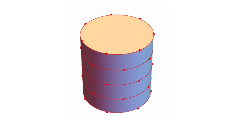 为了构造这个圆柱的灯笼近似,将圆柱分成四个相等的圆柱。在每个圆上放置七个等距的红点,就像这样,