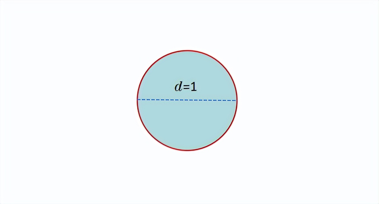 圆的直径和圆柱的高都是1。圆的周长是直径乘以圆周率,所以是圆周率。然后是蓝色圆柱的面积,就是这个周长乘以高度,也是圆周率。