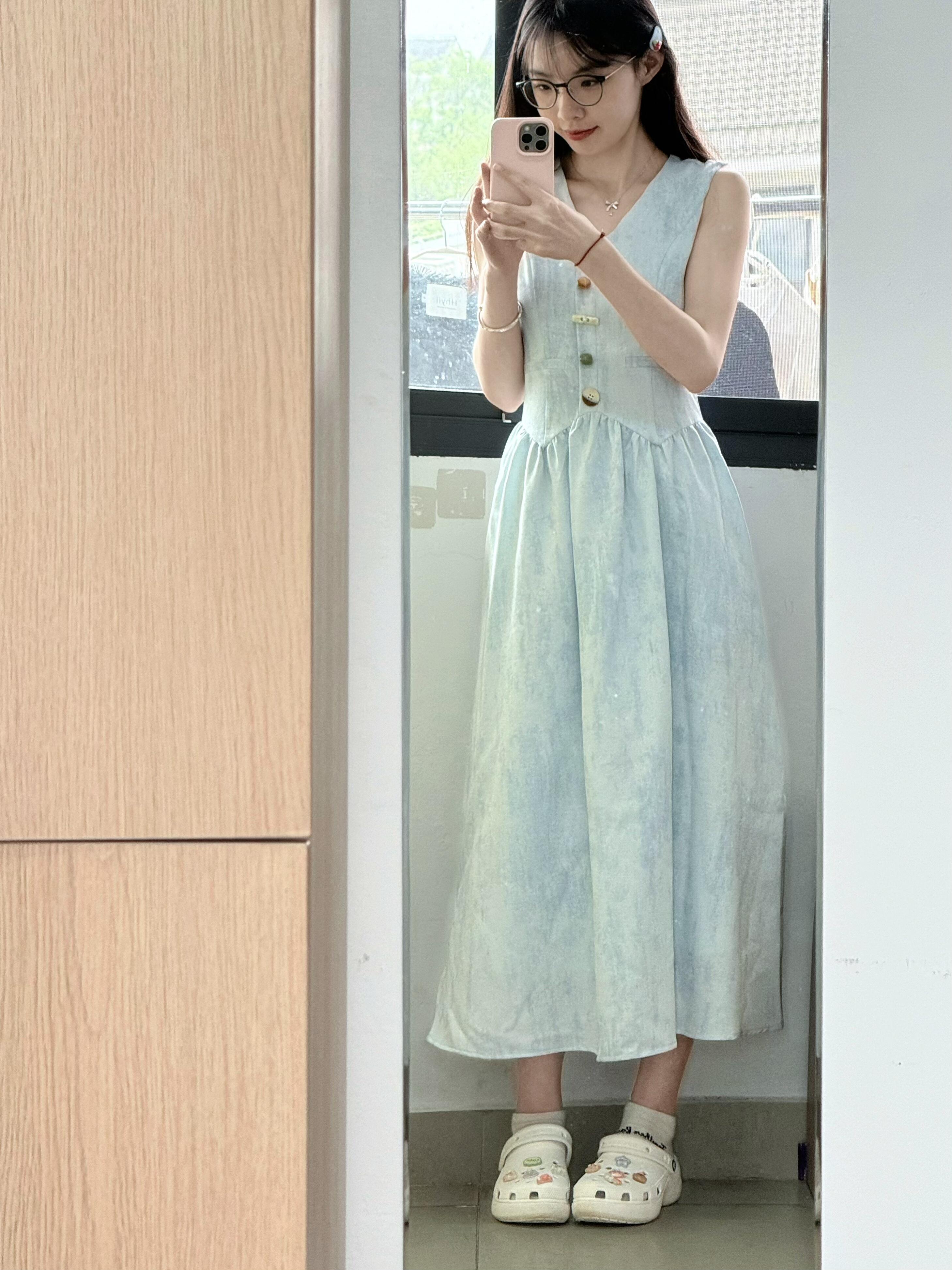 蓝色v领收腰无袖衬衫长裙!高级又气质