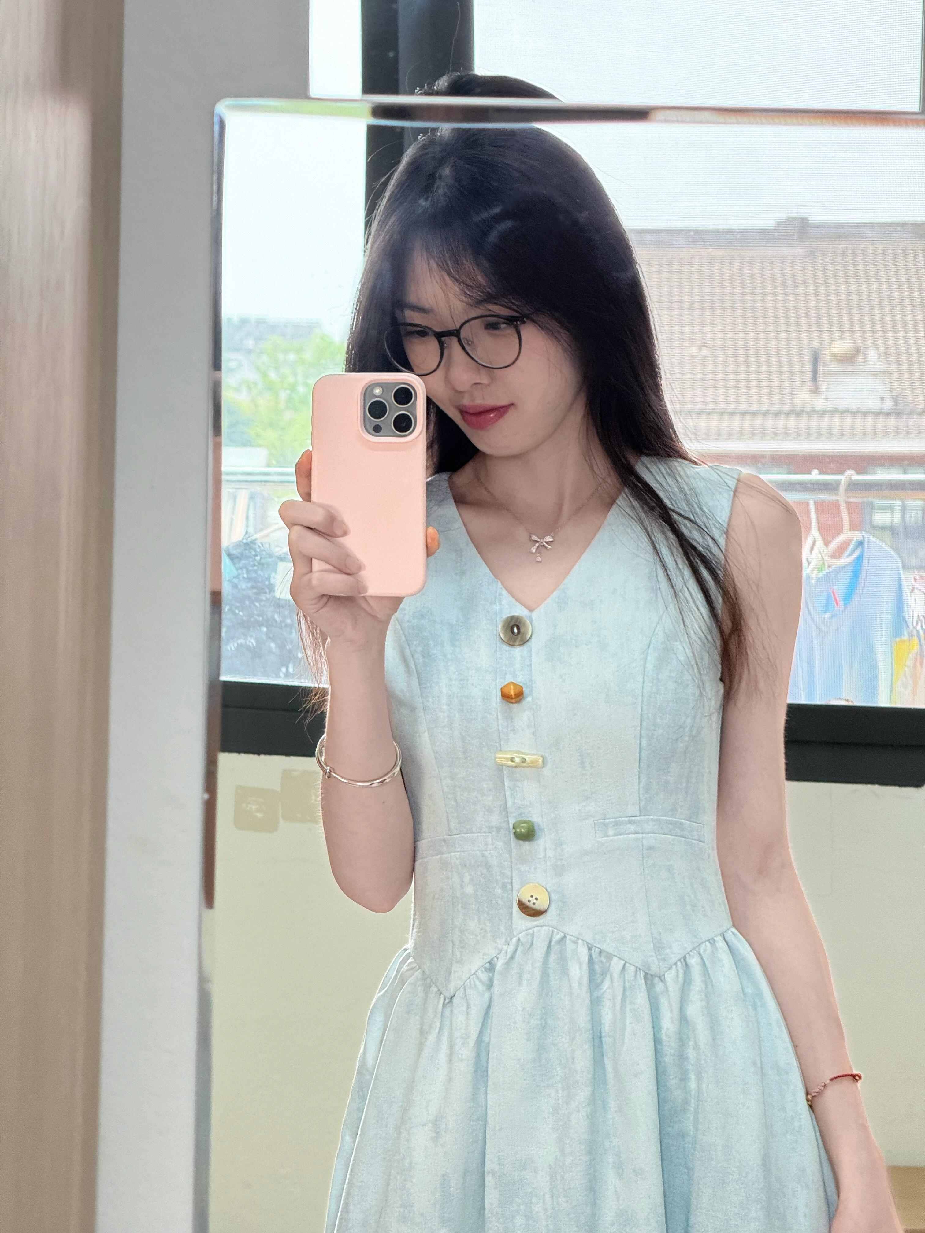 温柔海盐蓝v领收腰无袖衬衫裙!