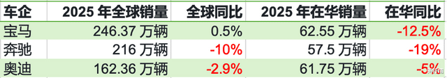 奔驰、宝马、奥迪2025年中国销量暴跌