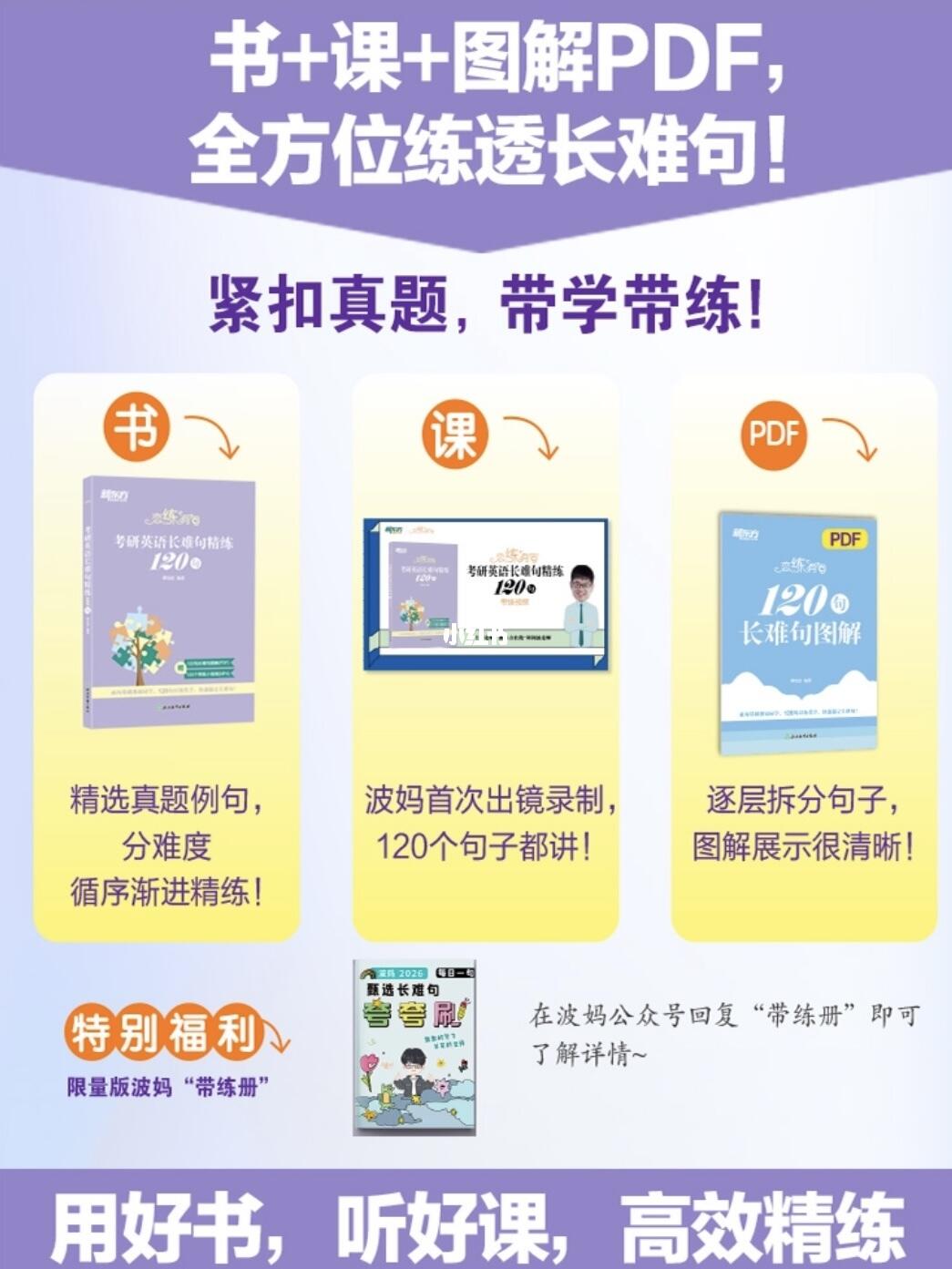 波妈《长难句精练120句》将在5.17号开启第二期带练哦 《长难句精练120句》是一本以练带学的语法书,跟16天搞定语法和长难句互补互促,这本小紫书可以可大家手中的小绿书《恋练有句》一起搭配使用的。 第一期我们在和视频平台带到了21句,已经学习过的同学可以再温习一下,新来的同学可以在这两周补完第一轮的内容,及时加入我们第二轮的打卡