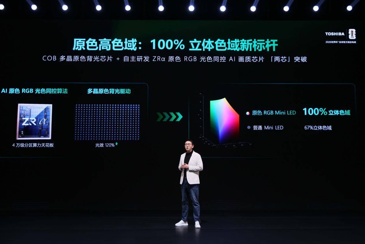 作为此次新品的核心技术亮点,原色RGB Mini LED实现了从硬件底层到算法引擎的全方位创新,彻底打破传统显示技术的色彩还原局限。在硬件层面,东芝采用多晶三原色背光芯片,实现红、绿、蓝三色独立精准控制,色纯度分别达99%、92%、100%,色域覆盖最高可达110% BT.2020,较普通Mini LED提升近30%、较OLED提升近10%,从光源源头筑牢原色还原根基,真正实现自然色彩的精准呈现。