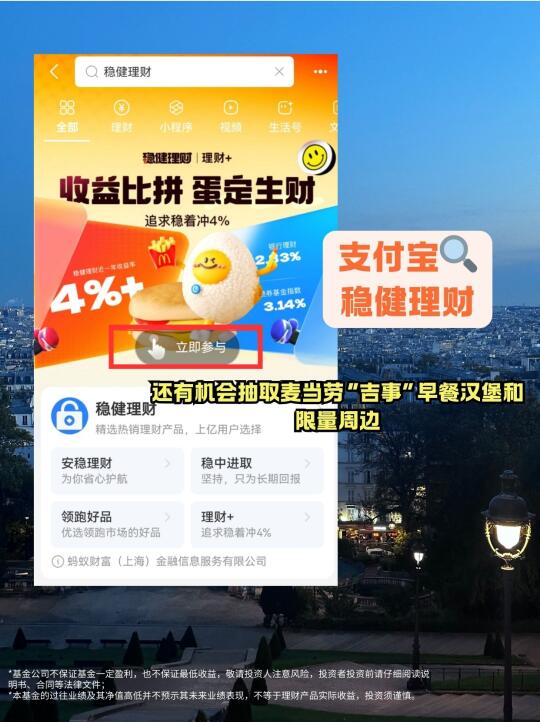 普通人投资“求稳”其实比“求富”更重要。大家可以先拿闲钱试试,现在上支付宝搜「稳健理财」,参加活动还有机会抽取麦当劳“吉事”早餐汉堡和限量周边,蛋定生财,吉事发生,有机会吃顿免费早餐,快试试!