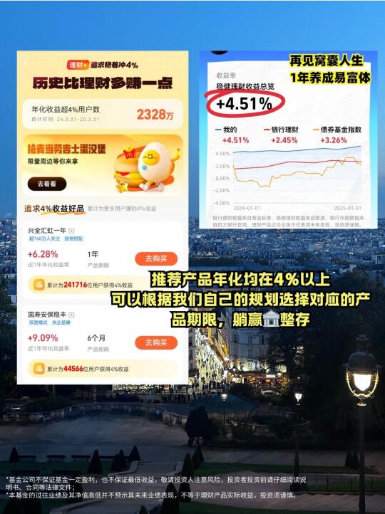 像我们这种上班族/有主业的人,没有太多精力分析数据、研究股票,而且股市波动巨大,一不小心就会套进去,存款放在银行定期,1.5%-2.5%的年化收益又觉得太低。所以我选择把部分存款放在支付宝的「稳健理财」。我选择这个的原因在于我没有太强的“暴富”愿望,也不想每天起床盯着股市焦虑,期望能有持续、稳定地增值收益,赚的钱可以当零花,也能追上通胀,我就很满意了。而稳健理财专区上面都是一年稳着冲4%的产品,主投债券抗风险能力强,就像是给资产积累开了外挂,能够更快实现我们的攒钱目标。