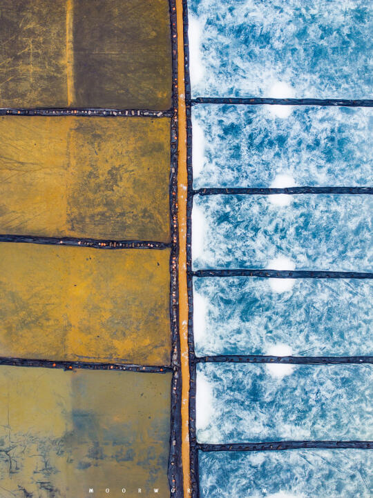 2、从空中俯瞰,徐闻的盐田色彩斑斓,如同大自然打翻的调色盘。由于盐田中卤水的浓度不同,在阳光的折射下呈现出不同的色彩;