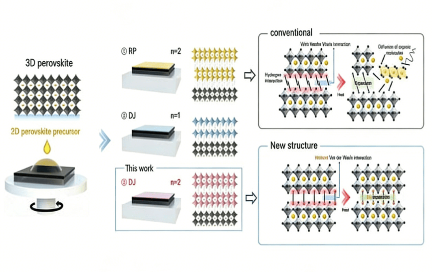 以往采用3D/2D结构策略,即在3D钙钛矿层上添加2D层,虽能减少表面缺陷并增强稳定性,但2D层结构若不够坚固,仍可能随时间变形或性能衰减。为解决这一问题,研究团队引入了结构更稳定的Dion–Jacobson(DJ)型2D钙钛矿钝化层,并提出精确控制“n值”的设计策略,其中n值代表钝化层内堆叠的钙钛矿层数。DJ结构通过有机分子在两侧牢固连接钙钛矿层,类似使用更强粘合剂固定砖块,从而提升结构稳定性。