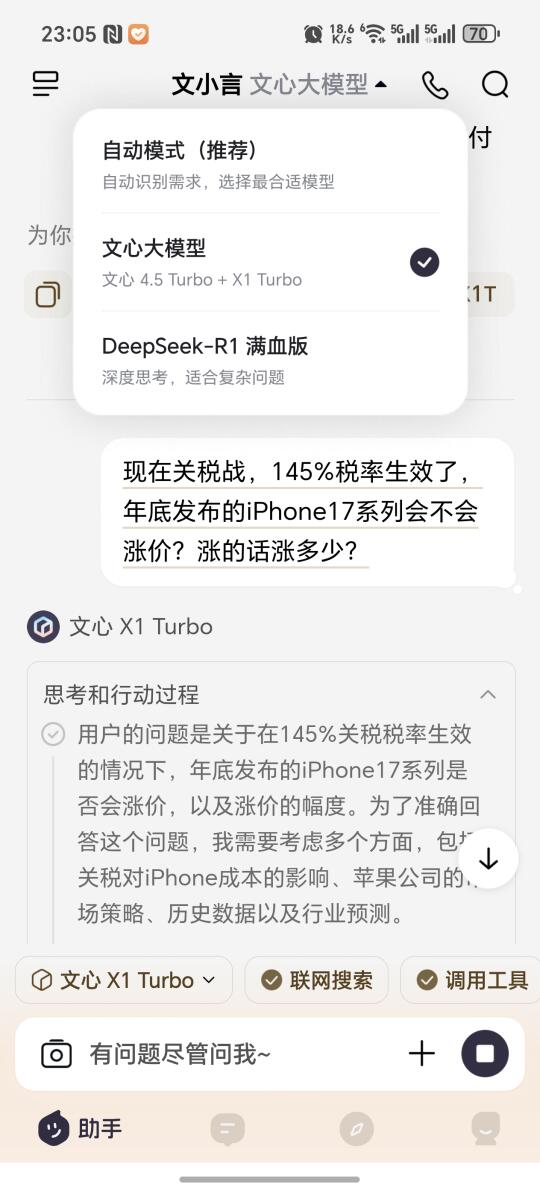 最近试一下文心刚刚升级的X1 Tuirbo,发现推理能力更上一层楼。我问了文心,现在关税战之后,年底发布的iPhone 17系列会不会涨价?给出的答案也是肯定的,但不会涨价145%那么多,因为苹果也会采取一些措施来避免涨价,最终涨价大概10%到40%,这也不少了,意味着iPhone17首发价可能来到7K价位,这大家受得了吗? 而且我还发现,文心现在可以直接发语音、视频、图片等内容,不用每次都文字描述,这用来查找电影、搜歌曲、查资料等都可以,这一点感觉比其他AI还要方便吧?