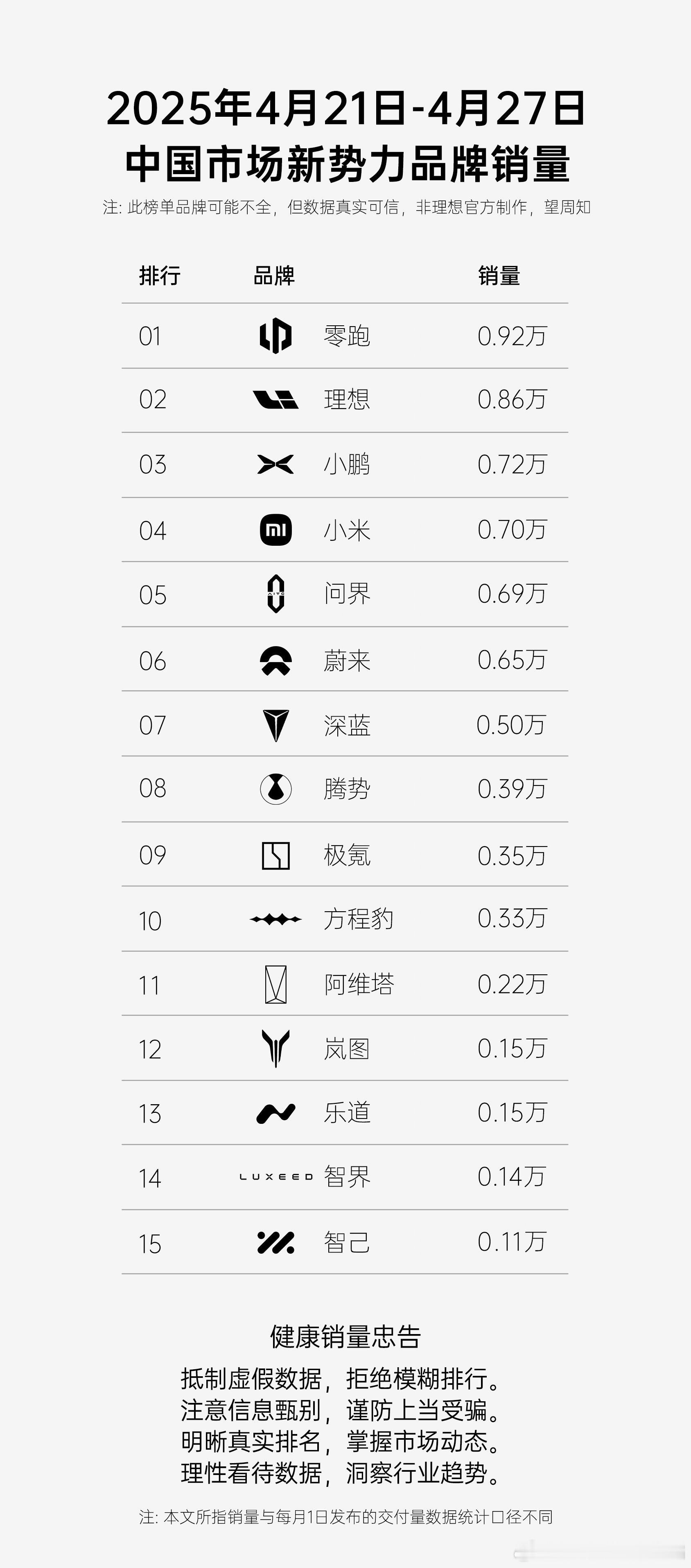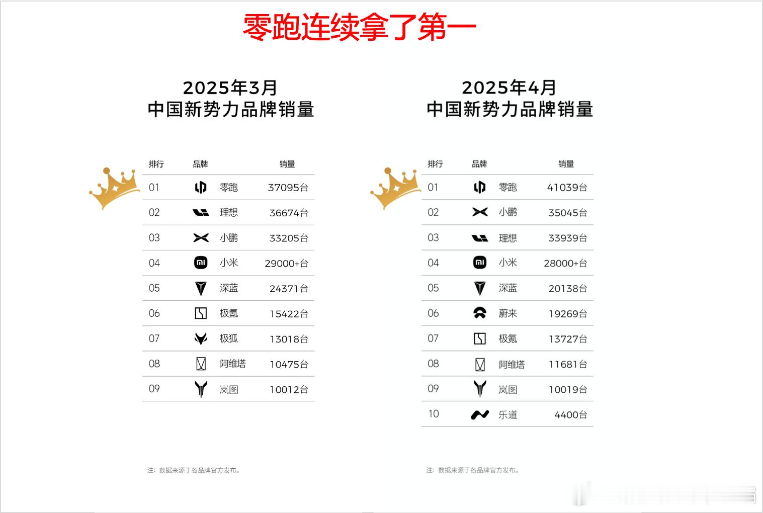 零跑新势力月销量连续第一论闷声干大事还得看零跑,4月又又领跑了,全车系交付41039台断层领先!如果说爆款是支撑销量的中流砥柱,那像零跑这种张张都是王牌,这局实在是很难输啊~4月上市的B10当月万辆下线,一举把激光雷达打到11万级,纯电续航510km起步,充得快跑得远,四项终身免费质保,抢起竞品饭碗没商量,这势头增长空间仍然可观,上市即爆款。C10的2026大改款预售开启,配置提升价格下探,一秒真香,15万级最值得买的家用SUV选手,小订火热排队中。最近零跑还迎来了B01全球首秀,主打15万级高颜值智能轿车,全球化审美、续航王者、同级最强智能,未来也是扛起销量的种子选手。