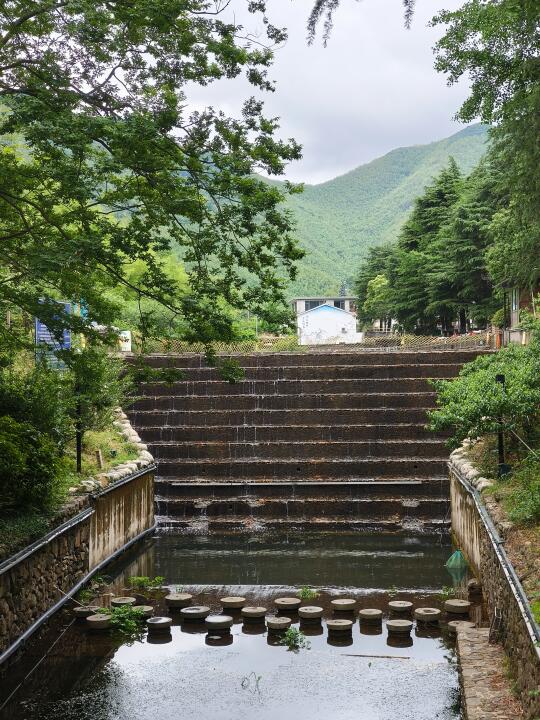 停车场距离登山口约2km,可以做景区观光车,也可以自行走上去。坐车速度快,自己走可以边走边玩水。建议走上去,爬完山坐车下来。