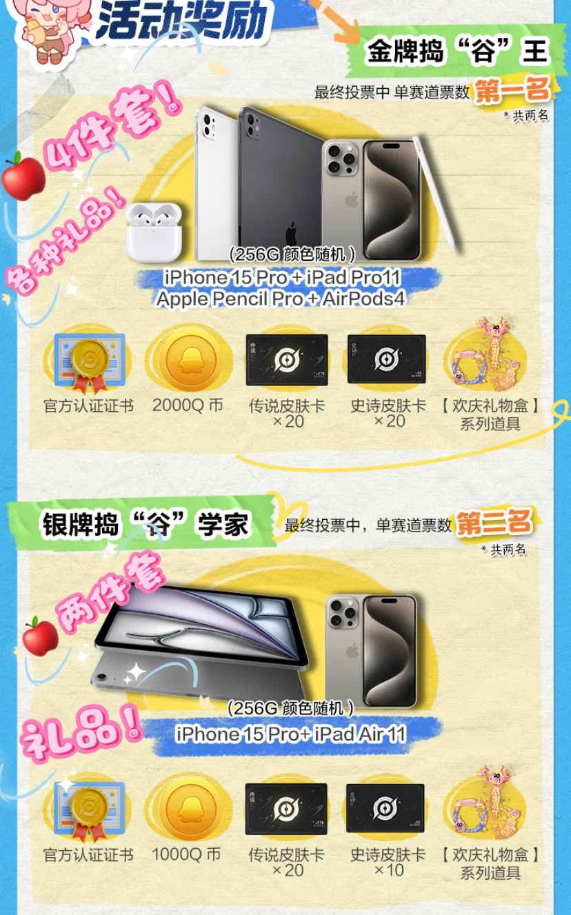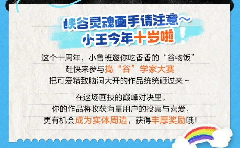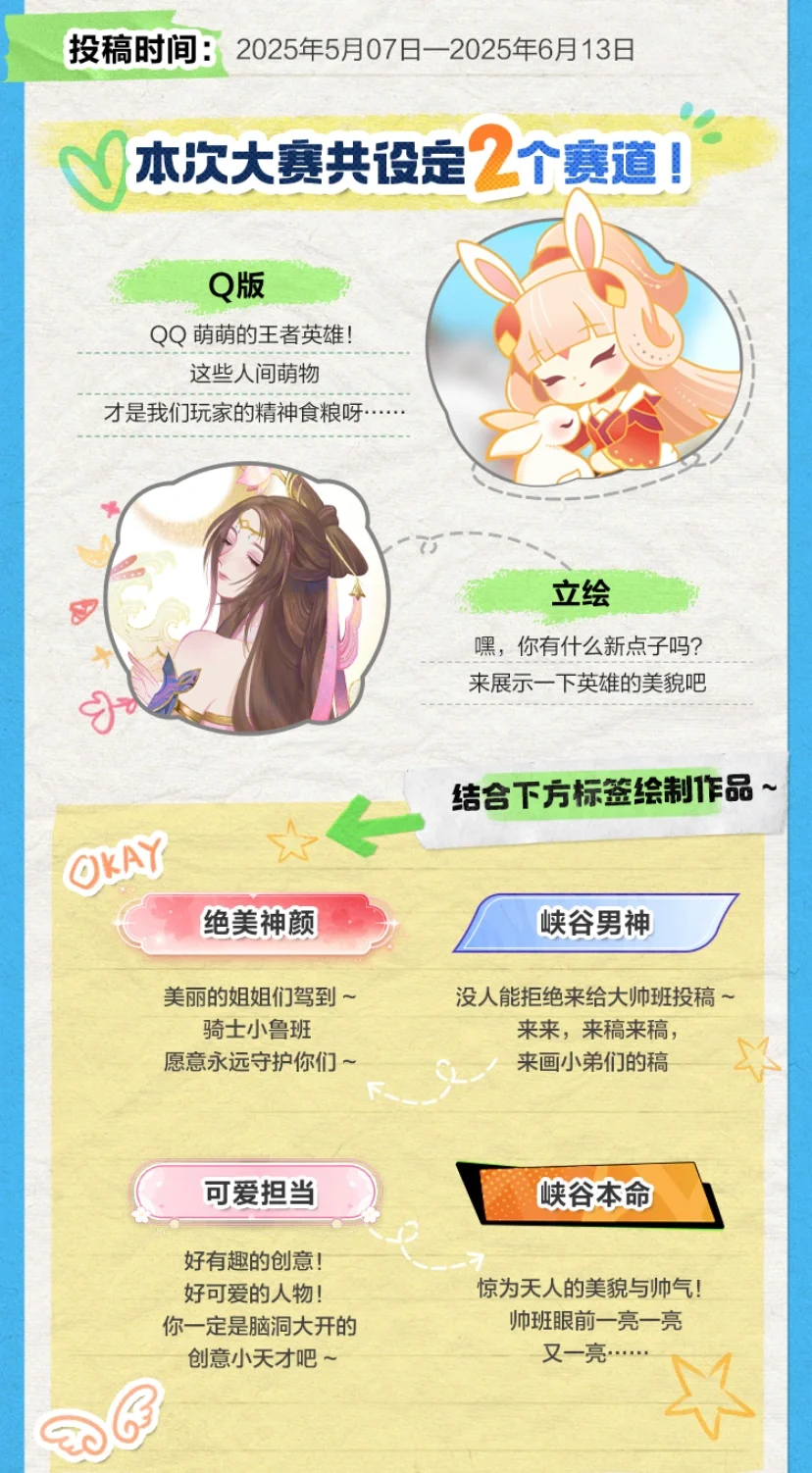 会画画的宝子有福啦!! 王者10岁邀请各位绘画老师出手啦 大赛投稿划分为Q 版、立绘两个赛道,获奖名额共36名!而且奖品都十分丰厚! 还有一个很好的点!就是获奖作品还能让自己的作品变为“官谷”!!让更多人关注[色色R] 会画画的宝子快出手吧!!