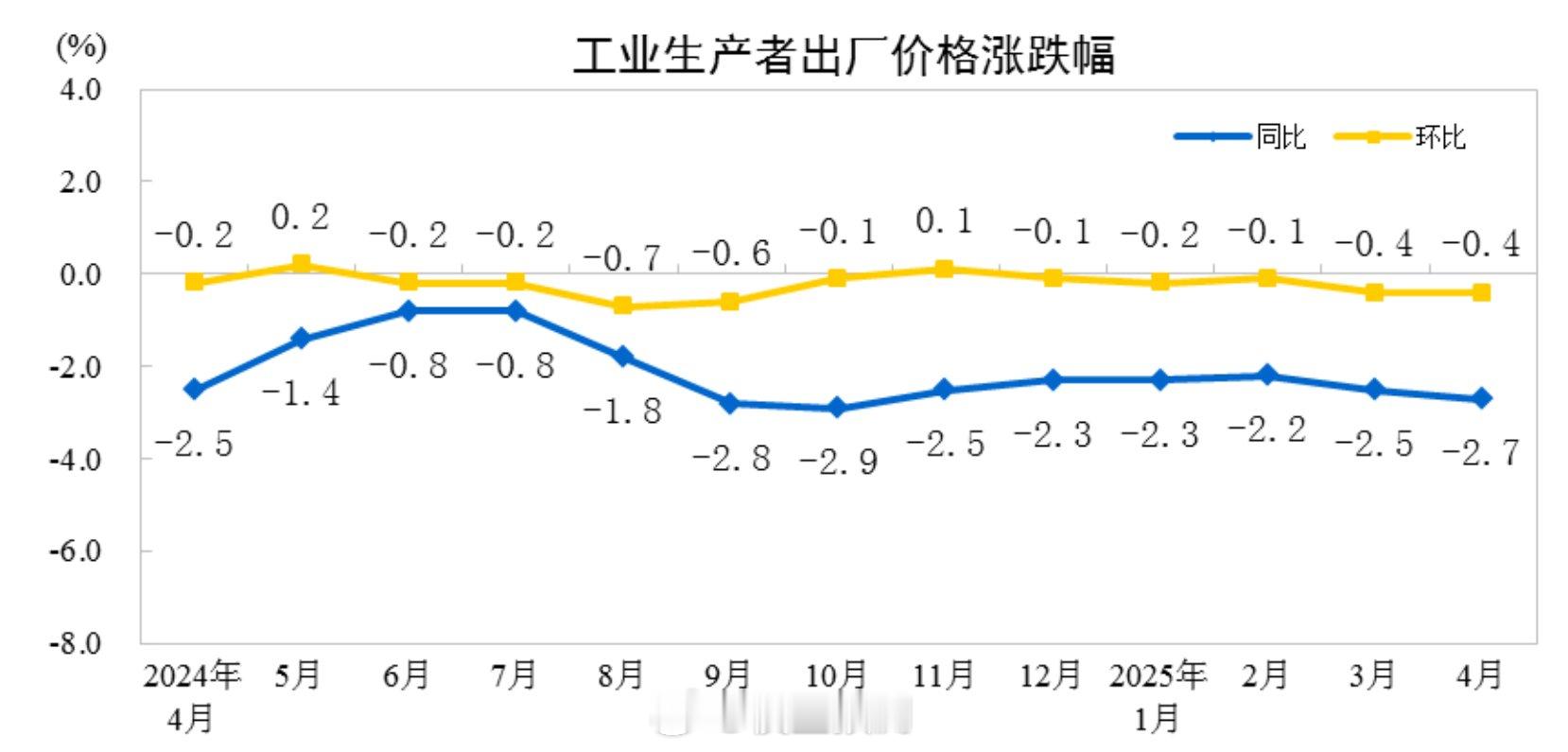 据财新,4月CPI同比下降0.1%,PPI同比降幅扩大至2.7%
