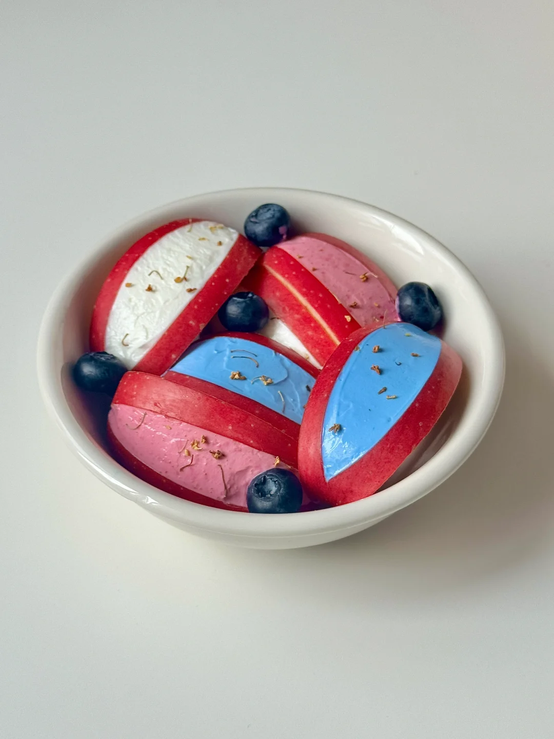最近水果夹酸奶真的好火呀!刚好家里有酸奶和苹果,那就来做一个三拼的苹果夹酸奶吧~ 👉🏻食材: 苹果|酸奶|藻蓝粉/甜菜根粉 👉🏻做法: ·苹果切成如图7样子 ·酸奶分成三份,其中两份分别混合藻蓝粉、甜菜根粉 ·把酸奶一点点、慢慢的抹到苹果夹里
