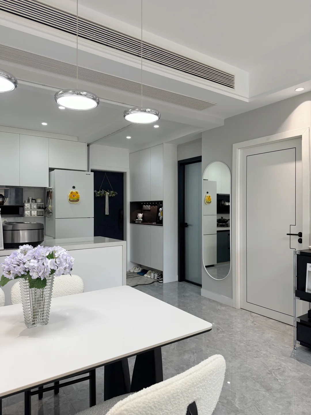 🏷餐厅放了1.4*0.8m的餐桌椅,一家三四口用着很宽敞,黑白配色和家里风格很搭~